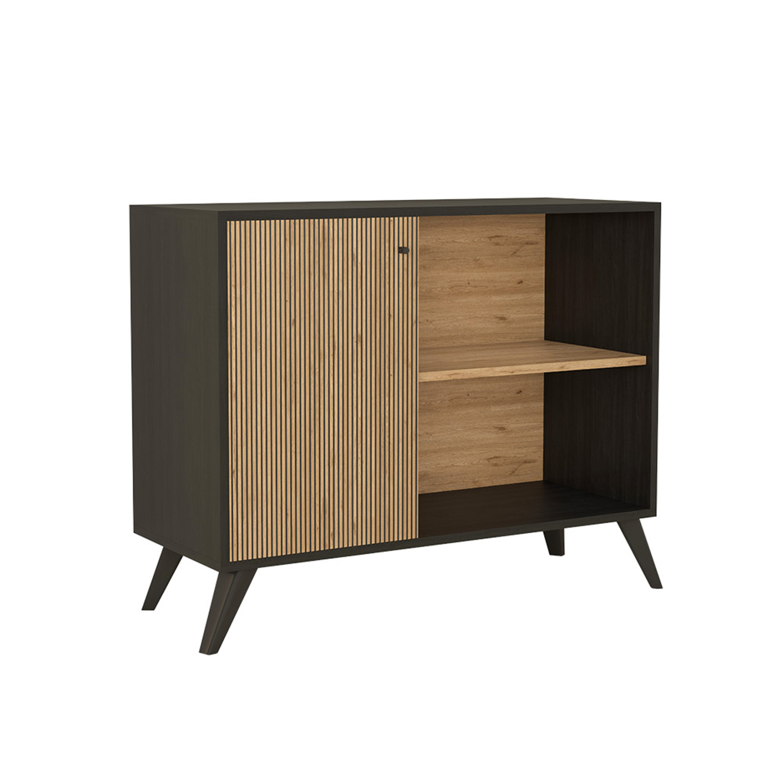 Ο μπουφές KRUDEN είναι ένα πρακτικό και βολικό σε διαστάσεις έπιπλο όπου κι αν τον τοποθετήσετε. Έχει ένα ντουλάπι με μικρό χερουλάκι στην μία πλευρά, ενώ το υπόλοιπο έπιπλο είναι ανοιχτός χώρος τοποθέτησης αντικειμένων με ένα ράφι. Το χρώμα όλης της κατασκευής είναι μαύρο, ενώ η πόρτα στο ντουλάπι και το ράφι είναι σε φυσικό χρώμα ξύλου. Ο μπουφές αυτός θα σας ενθουσιάσει! Τι είναι όμως ο μπουφές;