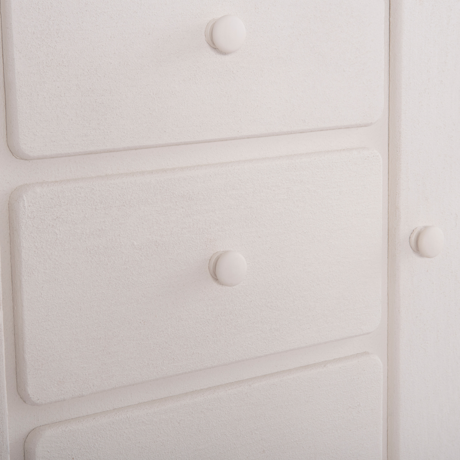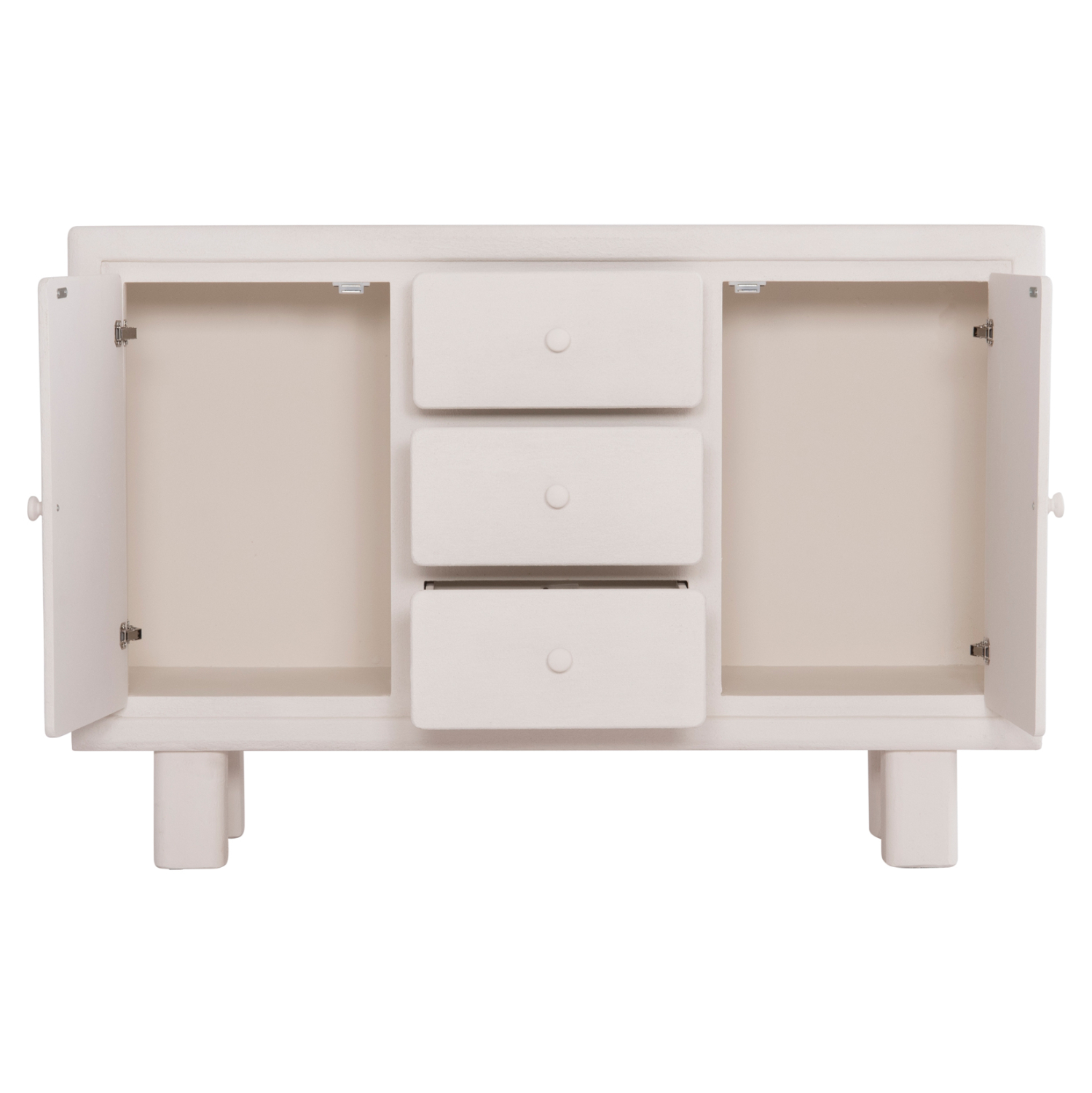 Ο χειροποίητος μπουφές αυτός είναι εξολοκλήρου κατασκευασμένος από MDF σε ΥΠΟΛΕΥΚΟ χρώμα με υφη σαγρέ τσιμέντου, που αποτελεί την πιο σύγχρονη τάση στον τομέα του interior design. Διαθέτει 3 συρτάρια στο κεντρικό μέρος και 2 αποθηκευτικούς χώρους δεξιά κι αριστερά που κλείνουν με πόρτες. Τι είναι όμως ο μπουφές;