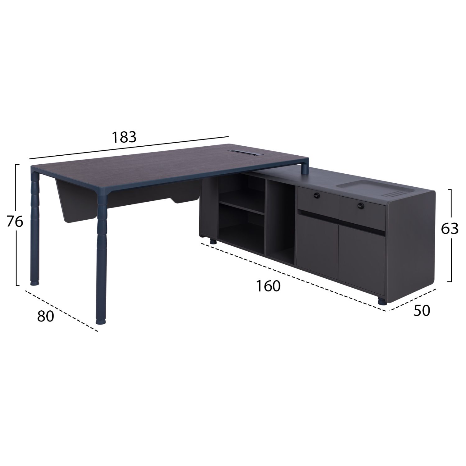 Επαγγελματικό γραφείο με δεξιά γωνία, κατασκευασμένο από μελαμίνη υψηλής ποιότητας, σε γκρι και βέγγε απόχρωση και πόδια αλουμινίου σε σκούρο μπλε χρώμα.