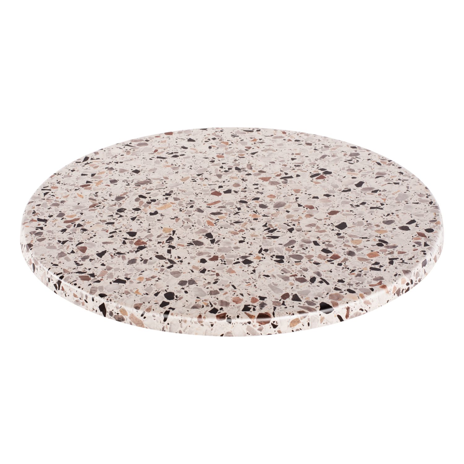 Επαγγελματική στρογγυλή επιφάνεια τραπεζιού σε χρώμα TERRAZZO (σαν μωσαϊκό), η οποία είναι κατάλληλη για επαφή με τρόφιμα και γενικά το υλικό είναι φιλικό προς το περιβάλλον. Μπορεί να χρησιμοποιηθεί σε καφετέριες, εστιατόρια, και τουριστικά καταλύματα, είτε σε εσωτερικούς, είτε σε εξωτερικούς χώρους.