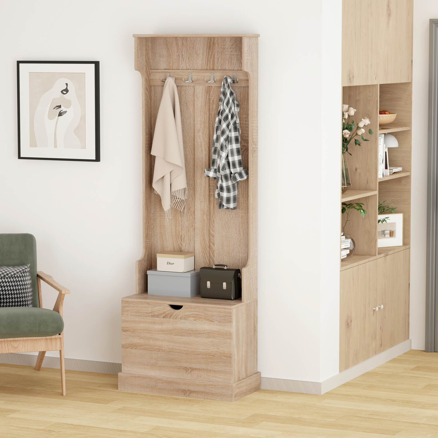 Ανακαλύψτε το καινούργιο έπιπλο εισόδου KAYLOR. Κατασκευασμένο από MDF σε χρώμα ΣΟΝΑΜΑ και με επίστρωση γυαλιστερής λάκας, είναι ένα όμορφο έπιπλο για την είσοδο του σπιτιού. Διαθέτει 4 διπλές κρεμάστρες (hooks) και στο κάτω μέρος έχει αποθηκευτικό χώρο, ο οποίος είναι προσβάσιμος ανασηκώνοντας την επάνω επιφάνεια του μέσω του όμορφου χωνευτού χερουλιού.