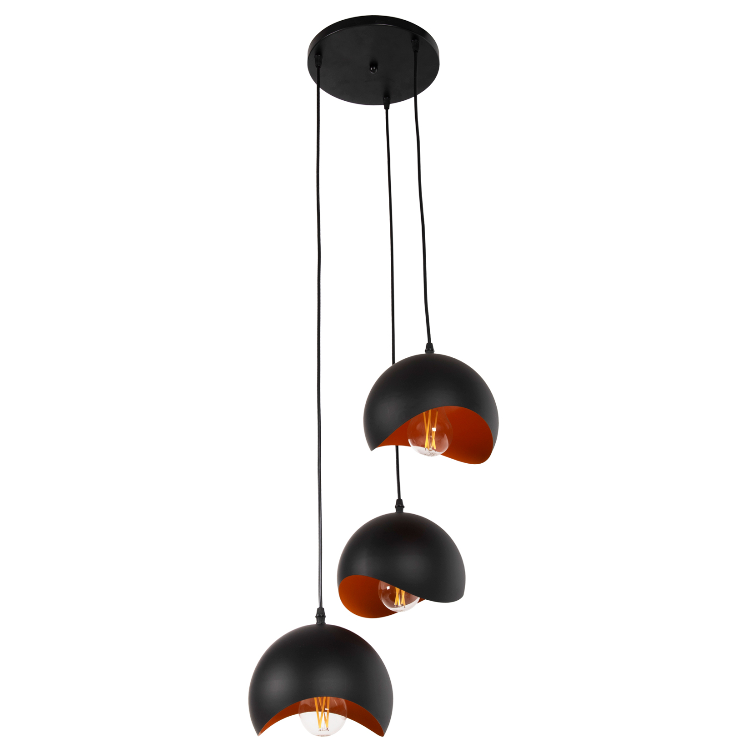 Αφήστε το φως να απλωθεί στον χώρο με ένα μοντέρνο και όμορφο κρεμαστό 3-φωτο οροφής, ολοκληρώνοντας την διακόσμησή σας. Τα συμπαγή σφαιρικά ΜΑΥΡΑ μεταλλικά καπέλα με ΠΟΡΤΟΚΑΛΙ εσωτερικό σε μοντέρνο design με καμπύλες σε διαφορετικά ύψη, θα δώσουν μια νέα εικόνα στον χώρο σας.