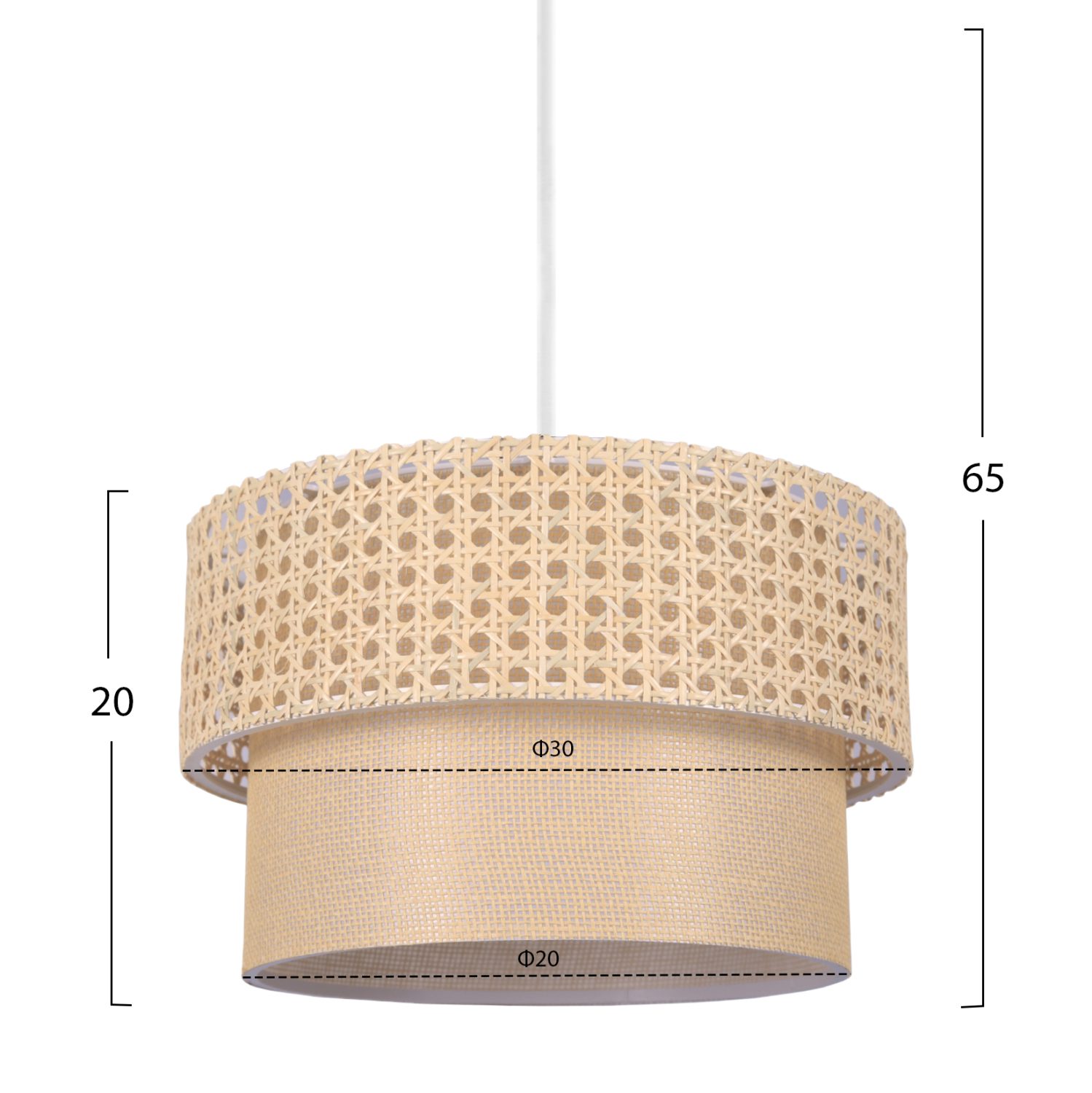 ΠΛΕΟΝΕΚΤΗΜΑΤΑ: Η αισθητική υπεροχή αυτού του φωτιστικού θα το κάνει να ξεχωρίζει στον χώρο σας γιατί έχει μια απλοϊκή αλλά καλλιτεχνική εμφάνιση. Ο μεταλλικός του σκελετός είναι άψογα κατασκευασμένος ενώ το τύμπανο έχει δύο δακτυλίους. Ο εξωτερικός δακτύλιος είναι κατασκευασμένος από μπεζ rattan πλέξη, ενώ το εσωτερικό από ύφασμα στο χρώμα της μπεζ άμμου. Το αποτέλεσμα είναι εξαιρετικά κομψό σε εμφάνιση. Καταφέρνει να συνδυάσει μια ελκυστική μοντέρνα γοητεία με το ιδανικό μέγεθος, προσθέτοντας έτσι μια όμορφη διακόσμηση στην οροφή σας. Το ρυθμιζόμενο ύψος του μπορεί να προσφέρει διαφορετικά επίπεδα φωτεινότητας και οπτικής απόλαυσης. Εκτός από διάφορα δωμάτια του σπιτιού σας, μπορεί, επίσης, να ταιριάξει και σε επαγγελματικούς χώρους όπως εστιατόρια, καφέ, ξενοδοχεία κτλ. Η εντύπωση της μονοχρωμίας του φωτιστικού και το design αιχμαλωτίζει τα βλέμματα, αλλά ταυτόχρονα απαιτεί και ιδιαίτερη διακοσμητική συνοχή για να αναδείξει πλήρως τις αισθητικές αρετές του.