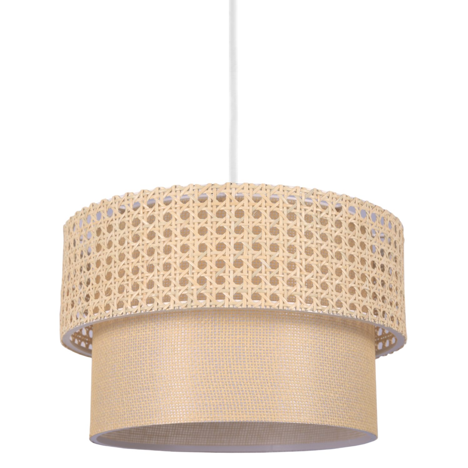 Η υφή του υφάσματος και η πλέξη rattan από πάνω, μπορεί να είναι λίγο ασυνήθιστη για κρεμαστό φωτιστικό, αλλά χάρη στο ανοιχτό χρώμα των τυμπάνων, δίνει στο φως μια απαλή λάμψη.