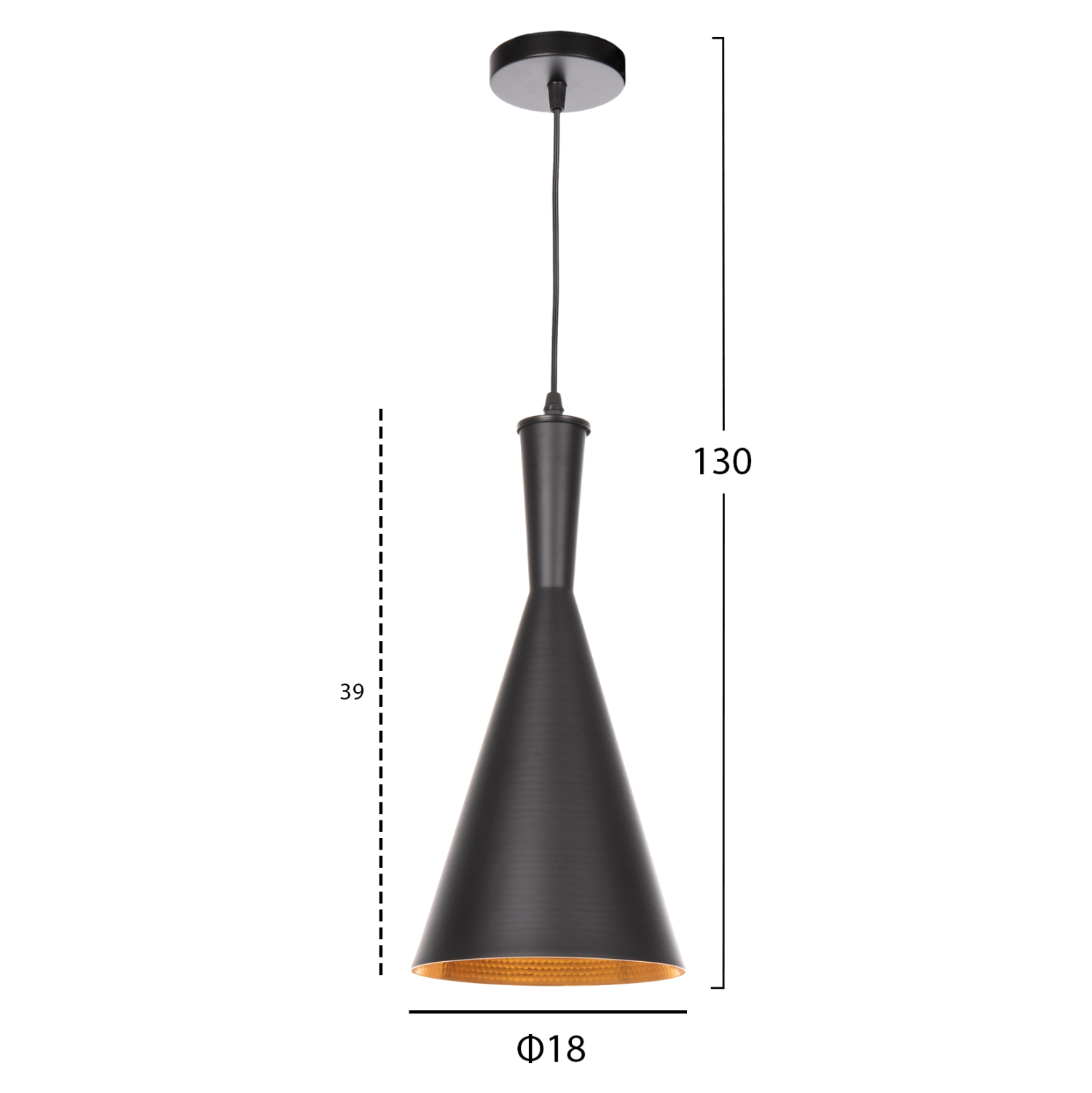 Ανακαλύψτε αυτό το νέο μας κρεμαστό φωτιστικό οροφής και ολοκληρώστε την διακόσμησή σας. Πρόκειται για ένα φωτιστικό με ΜΑΥΡΟ καπέλο ΑΛΟΥΜΙΝΙΟΥ σε σχήμα μακρόστενης καμπάνας με χρυσή επιφάνεια στην εσωτερική πλευρά του φωτιστικού.