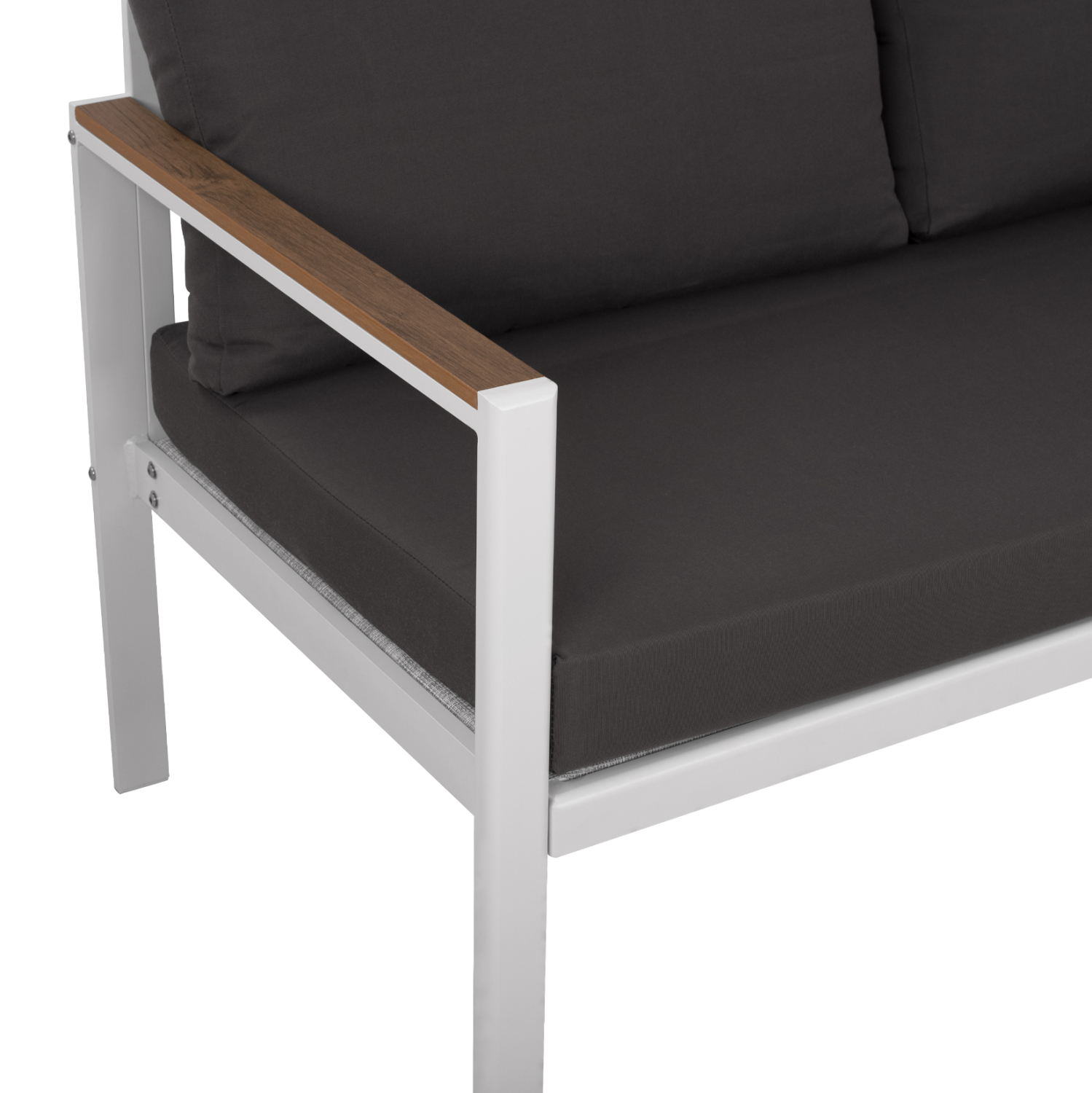 Ο SAFIYA είναι ένας όμορφος 2θέσιος καναπές εξωτερικού χώρου σε συνδυασμό ΛΕΥΚΟΥ-ΑΝΘΡΑΚΙ. Ο συνδυασμός του σκελετού αλουμινίου σε ΛΕΥΚΟ χρώμα με τα μεγάλα μαξιλάρια πλάτης και καθίσματος με πολυεστερικό ύφασμα σε ΑΝΘΡΑΚΙ χρώμα είναι μοναδικός, και μπορεί να αλλάξει άμεσα την εικόνα οποιουδήποτε εξωτερικού χώρου. Χαρακτηριστικό γνώρισμα αυτού του καναπέ είναι ότι τα πόδια είναι ψηλά, με αποτέλεσμα και το ύψος του καθίσματος να είναι ψηλό, ενώ η «πινελιά» με το polywood στα μπράτσα δίνει έναν τόνο πολυτέλειας που δεν περνάει απαρατήρητη.