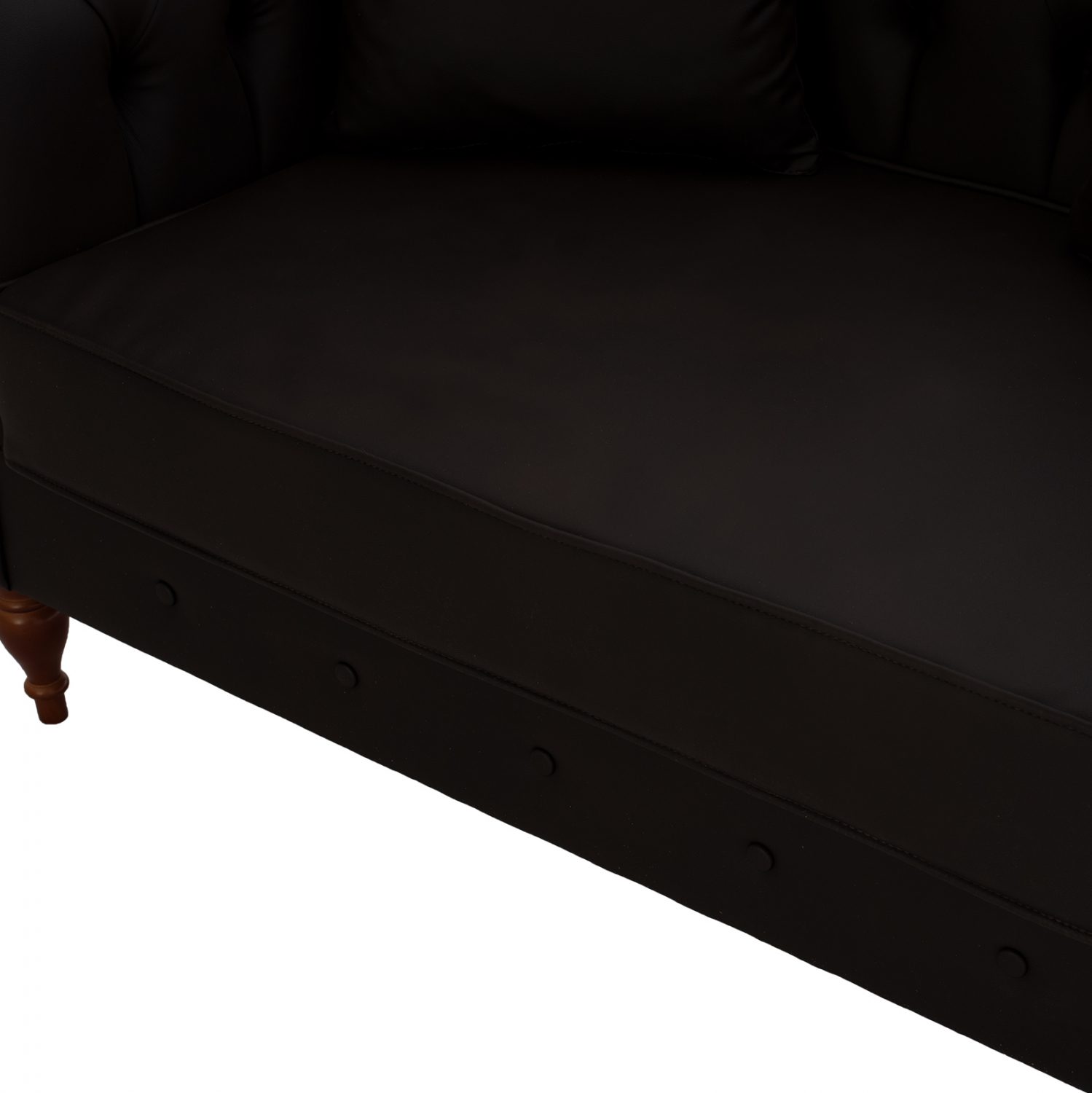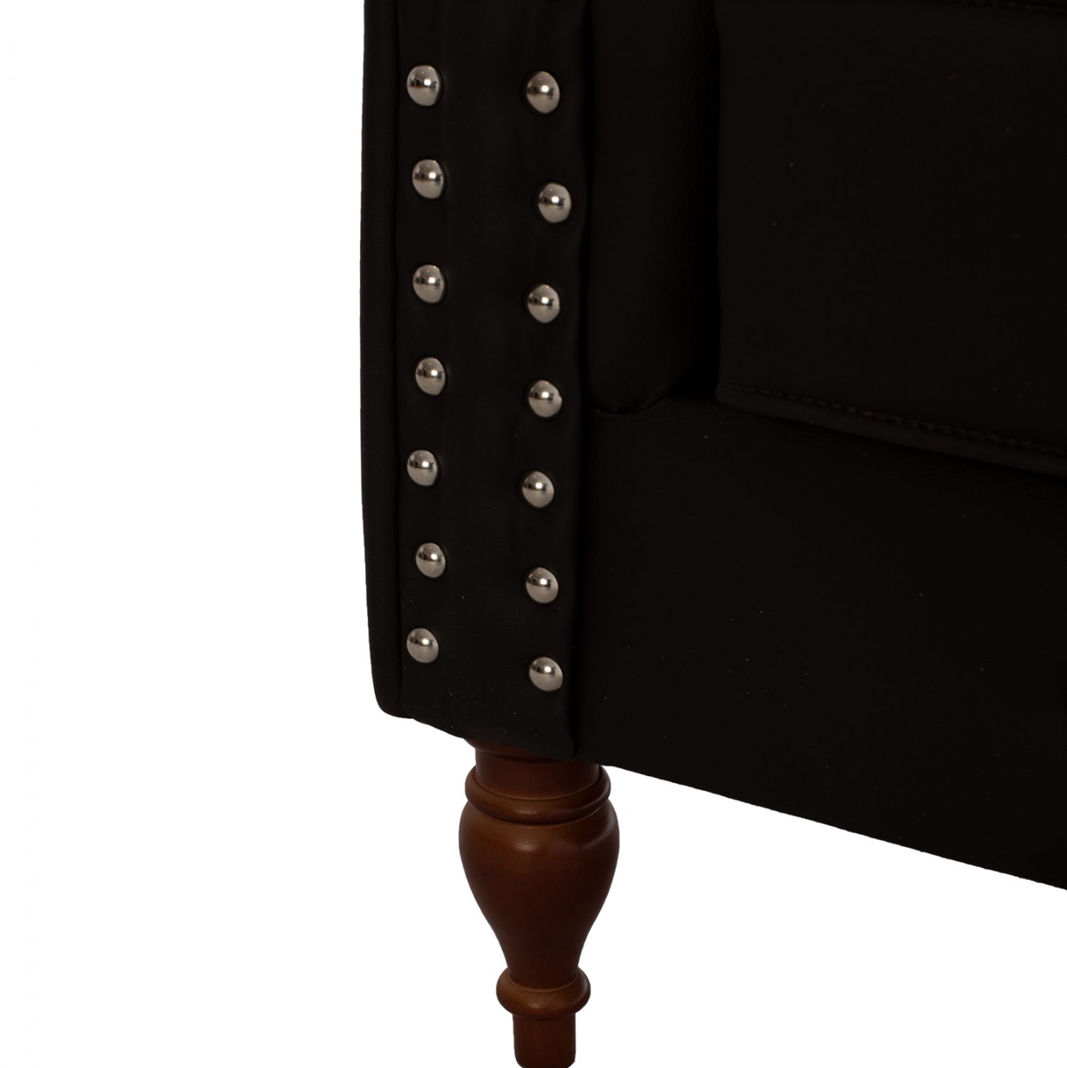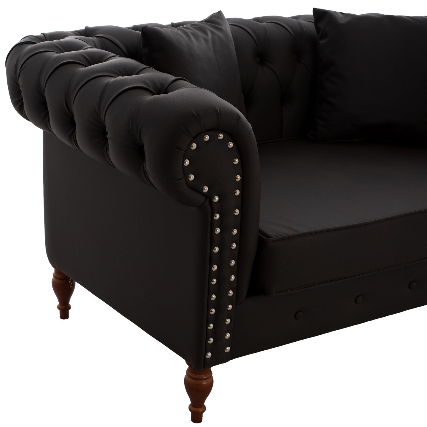 Ο διθέσιος καναπές είναι επενδεδυμένος με τεχνόδερμα υψηλής ποιότητας, καθαρίζεται εύκολα, ενώ διαθέτει ενισχυμένα ξύλινα πόδια σε καρυδί χρώμα, που τον καθιστούν ιδιαίτερα σταθερό και ανθεκτικό.