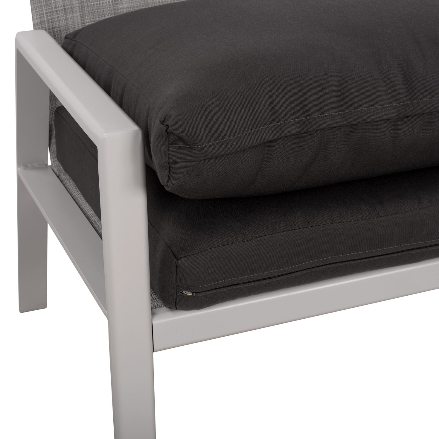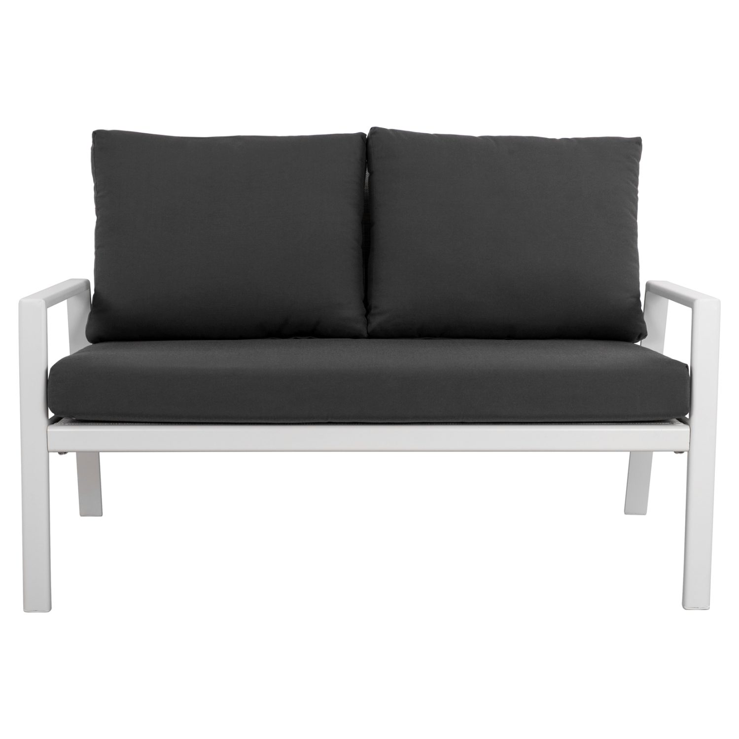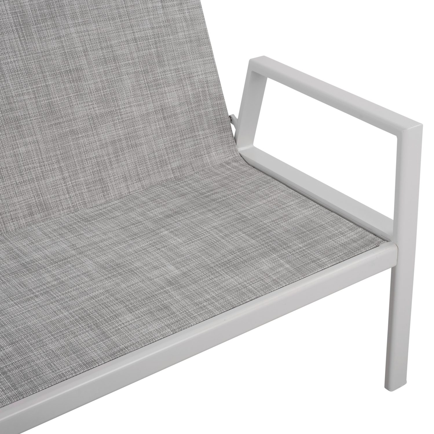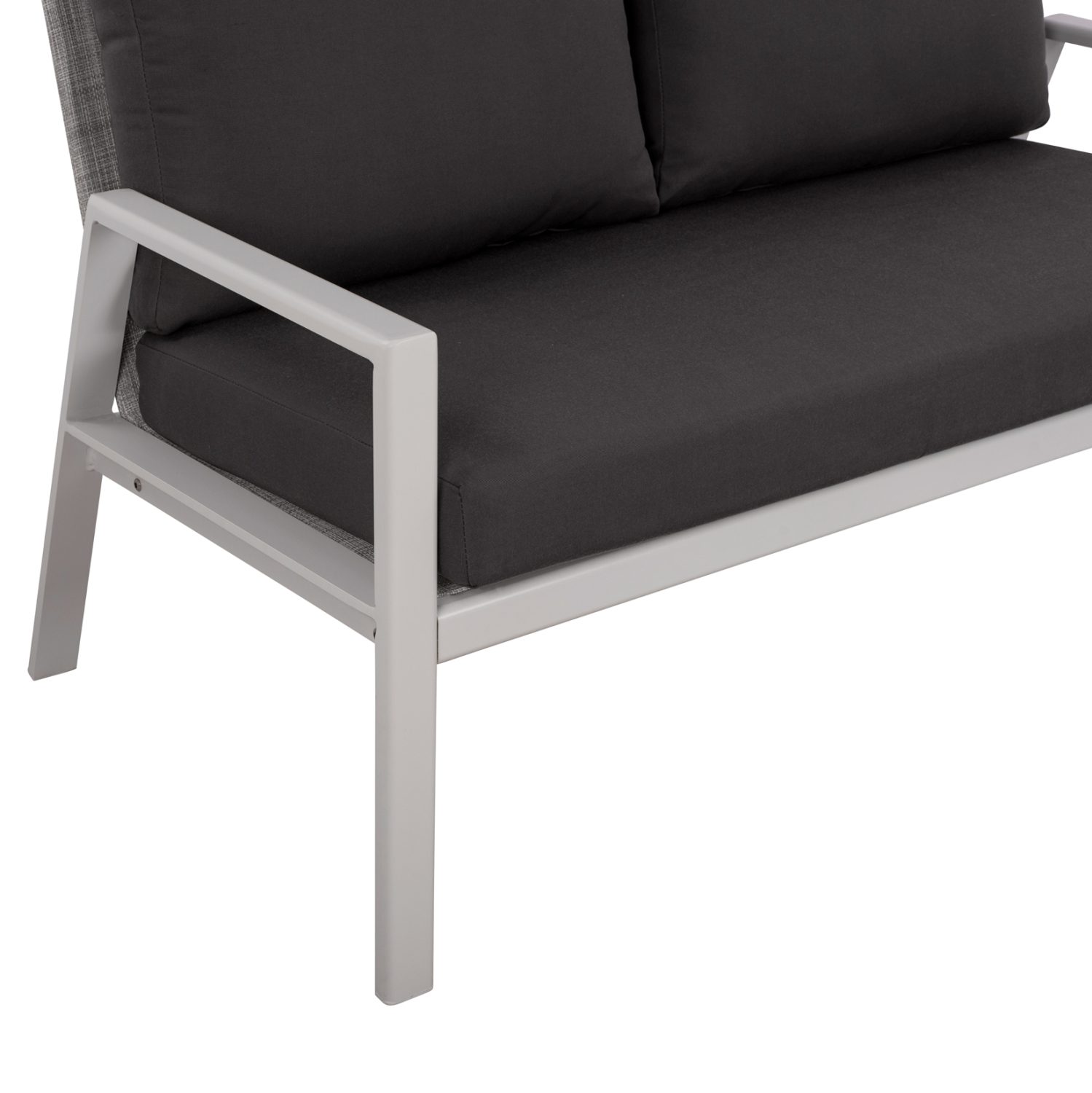 Καναπές διθέσιος με σκελετό αλουμινίου σε λευκή απόχρωση επενδυμένο σε κάθισμα και πλάτη από ύφασμα textiline και υφασμάτινα μαξιλάρια σε γκρι χρώμα.