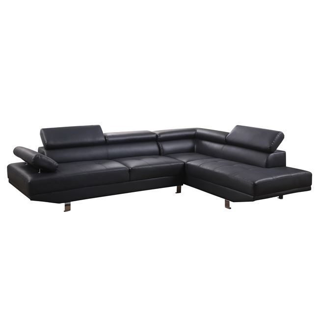 Καναπές δεξιά γωνία, επενδυμένος με τεχνόδερμα σε μαύρη απόχρωση και ψηλά μεταλλικά πόδια.
