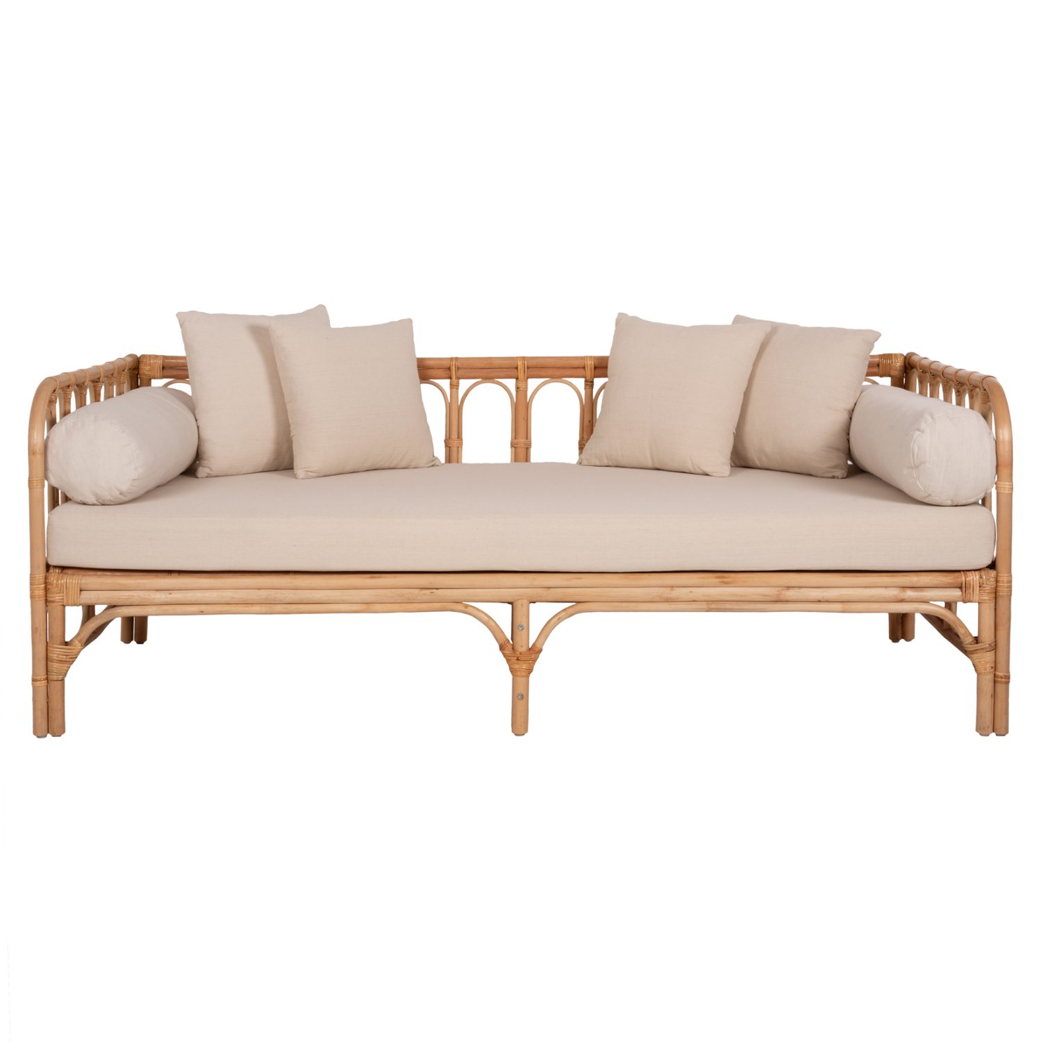 Καναπές την ημέρα, κρεβάτι το βράδυ ή όποια άλλη ώρα θέλετε! Ακριβώς αυτή είναι η λεζάντα που περιγράφει με τον τελειότερο τρόπο τον LIGNANO. Έναν καναπέ μοναδικό στο είδος του. Διαθέτει κοντή πλάτη ενώ τόσο τα μπράτσα όσο και τα πόδια είναι ψηλά. Γενικά, το design του παραπέμπει περισσότερο σε μεγάλο ανάκλιντρο παρά σε καναπέ όπως τον ξέρουν όλοι. Διαθέτει αναπαυτικό στρώμα με ΜΠΕΖ ύφασμα, δύο κυλινδρικά μαξιλάρια μπράτσων και 4 ακόμα μαξιλάρια, τα οποία συμπληρώνουν όμορφα αυτόν τον πολύ ιδιαίτερο καναπέ. Είναι εξολοκλήρου κατασκευασμένος από Rattan στο φυσικό του χρώμα και είναι σίγουρο ότι θα αποτελέσει πραγματικό «κόσμημα» στον χώρο σας.
