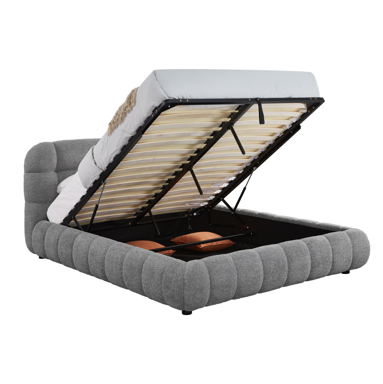 Το στρώμα «κάθεται» πάνω σε δύο σειρές από ανατομικές τάβλες. Επιπλέον, το μεταλλικό τελάρο με τις τάβλες στήριξης του στρώματος ανασηκώνεται με μεταλλικό μηχανισμό ασφαλείας με αμορτισέρ που κρατάει το τελάρο ανασηκωμένο για όσο χρόνο χρειάζεται, προσφέροντας έναν μεγάλο αποθηκευτικό χώρο, ο οποίος φυσικά καταλαμβάνει όλο τον χώρο μέχρι το δάπεδο. Τα πόδια είναι χαμηλά από ενισχυμένο πολυαιθυλένιο.