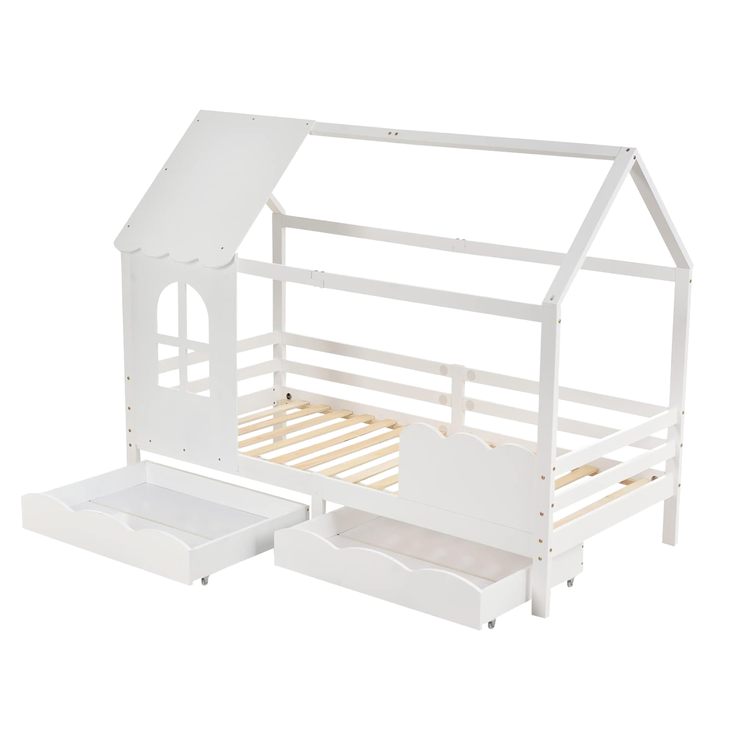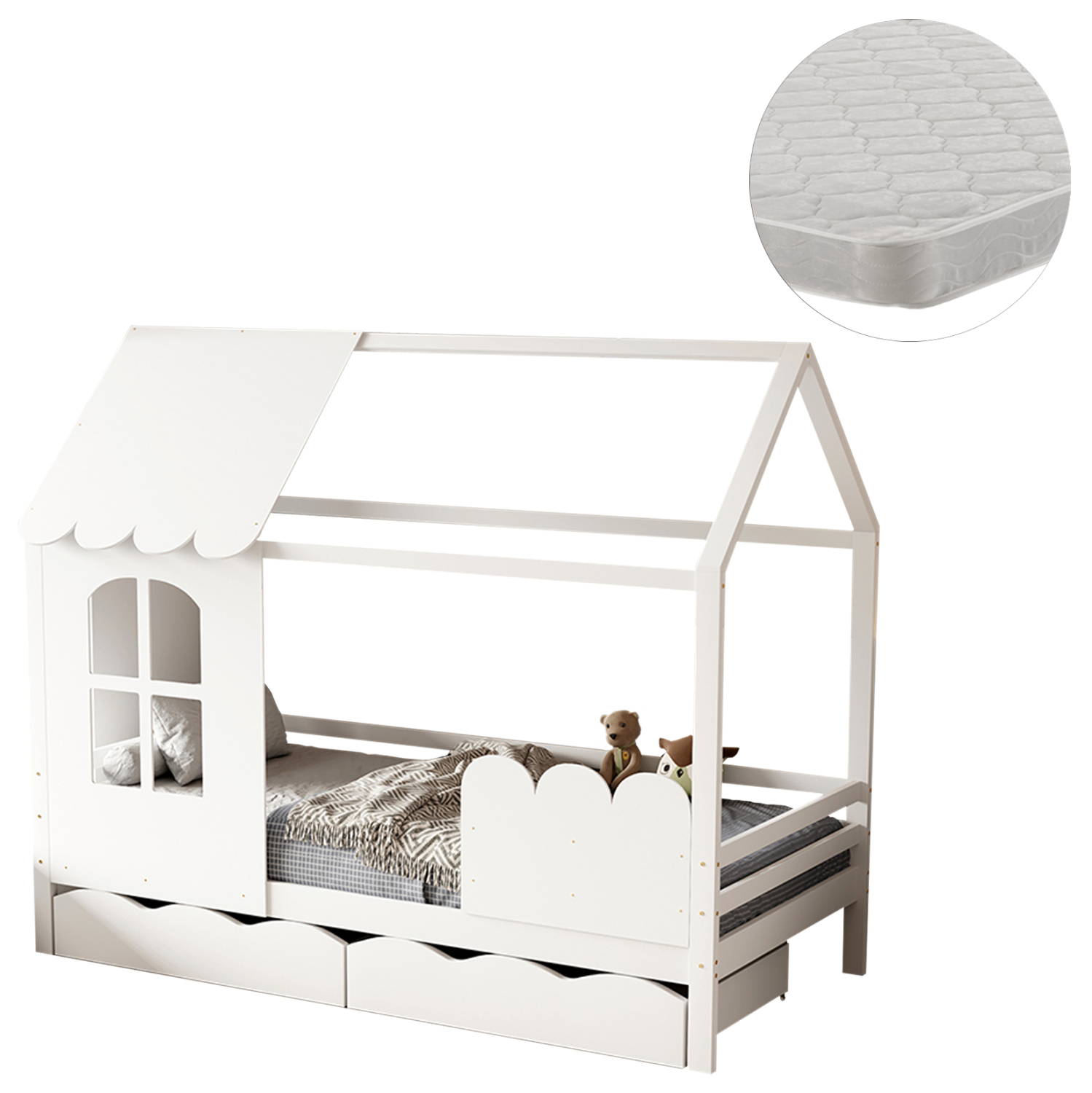 Το παιδικό κρεβάτι DOMER τύπου Montessori σε διάσταση για στρώμα 90×190εκ, είναι κατασκευασμένο από ξύλο πεύκου σε ΛΕΥΚΟ χρώμα. Όλο το κρεβάτι έχει σχήμα σπιτιού με παραθυράκι και διαθέτει 2 συρτάρια στο κάτω μέρος ως αποθηκευτικό χώρο αλλά και προστατευτικό κάγκελα, ενώ το στρώμα τοποθετείται σε τάβλες από κόντρα-πλακέ ξυλεία.