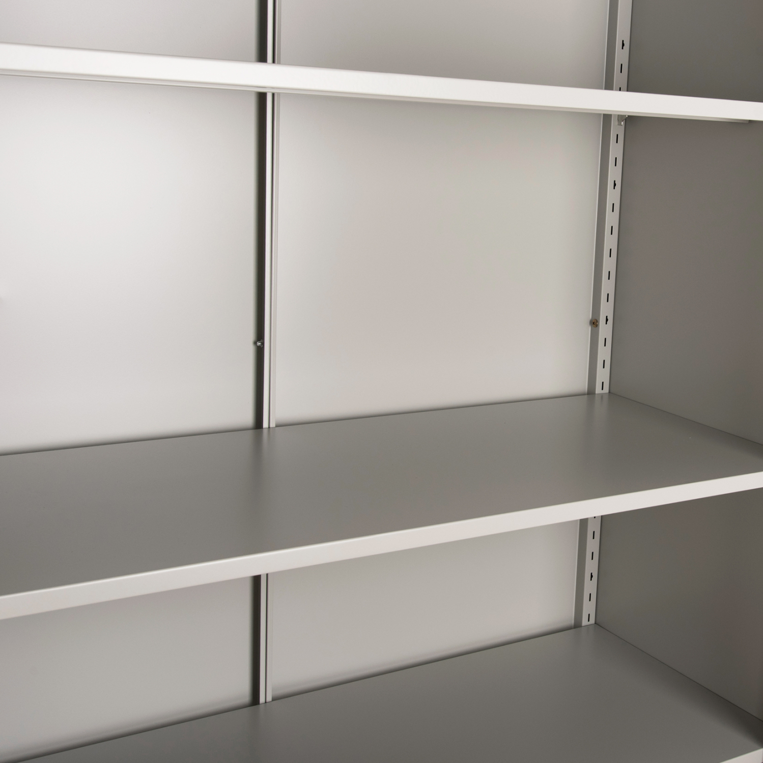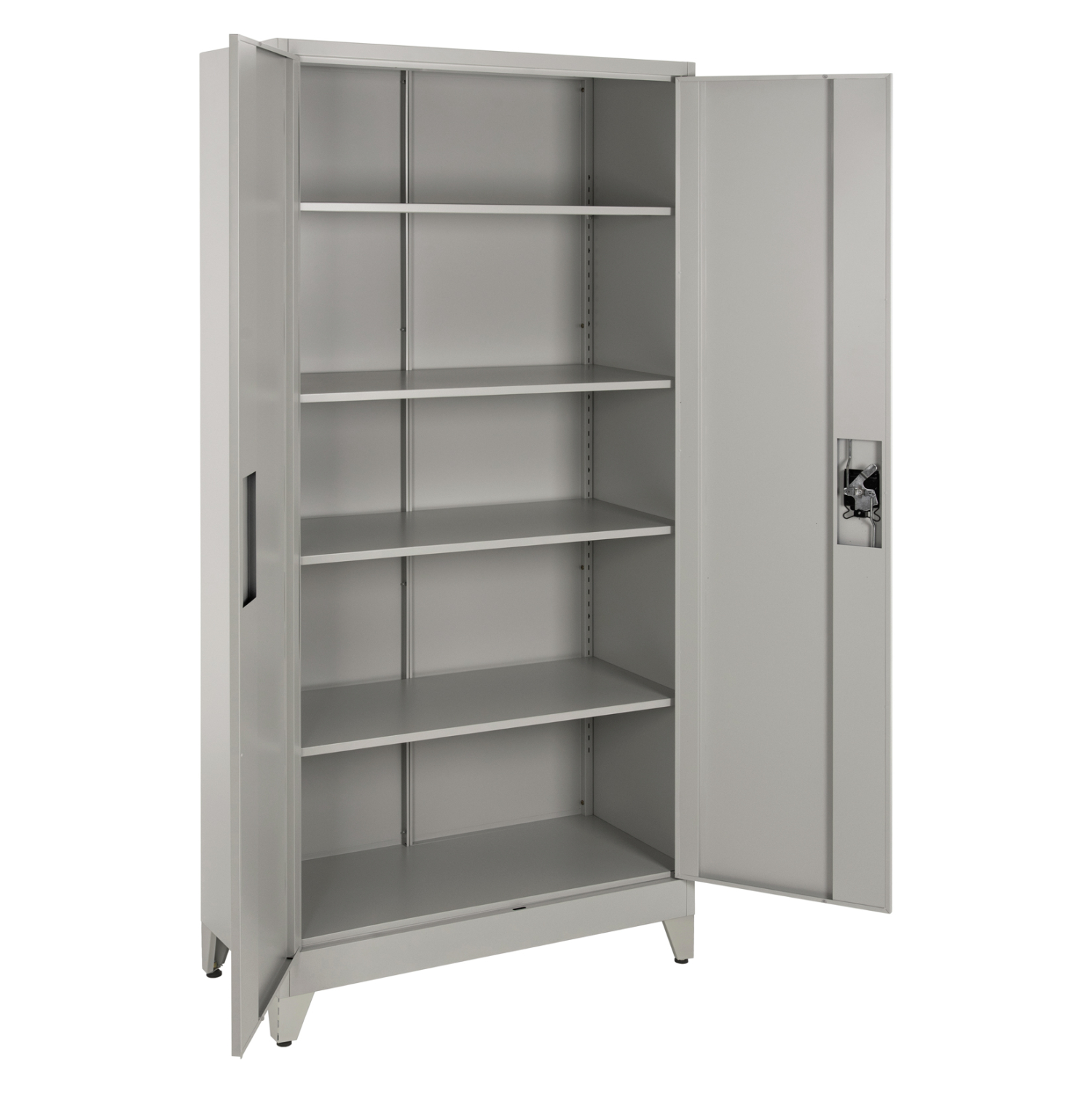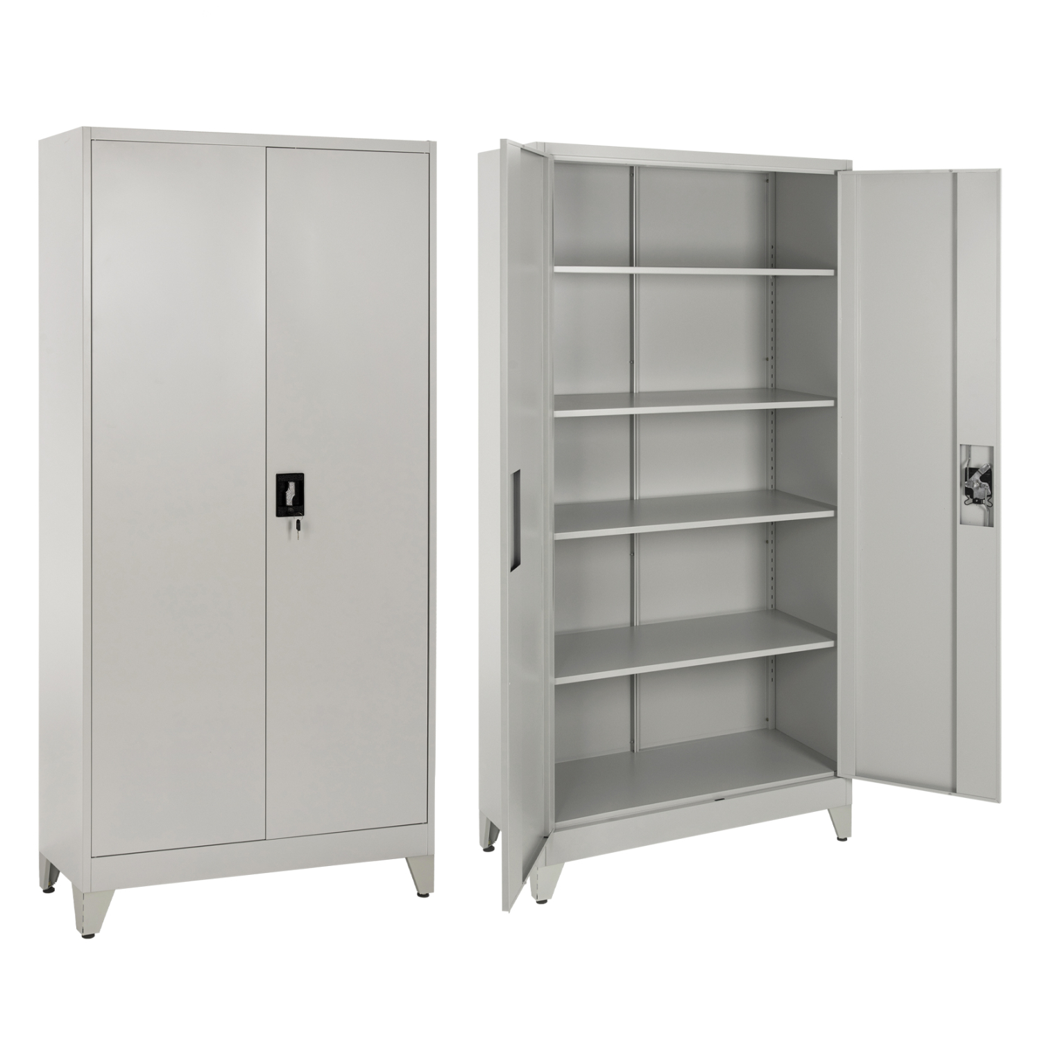 Η DURON είναι μια πρακτικότατη μεταλλική ντουλάπα με πόδια που έχει φτιαχτεί με γνώμονα την χωρητικότητα και την ανθεκτικότητα. Είναι δίφυλλη με τις δύο πόρτες να κλείνουν ακριβώς στην μέση της κατασκευής, ενώ το εσωτερικό είναι ένας ενιαίος χώρος χωρίς κάθετα χωρίσματα. Διαθέτει 4 ράφια που δημιουργούν 5 αποθηκευτικούς χώρους. Οι πόρτες διαθέτουν κλειδαριά που κλειδώνει με κλειδί, ενώ το χρώμα της ντουλάπας είναι πολύ ανοιχτό γκρι.