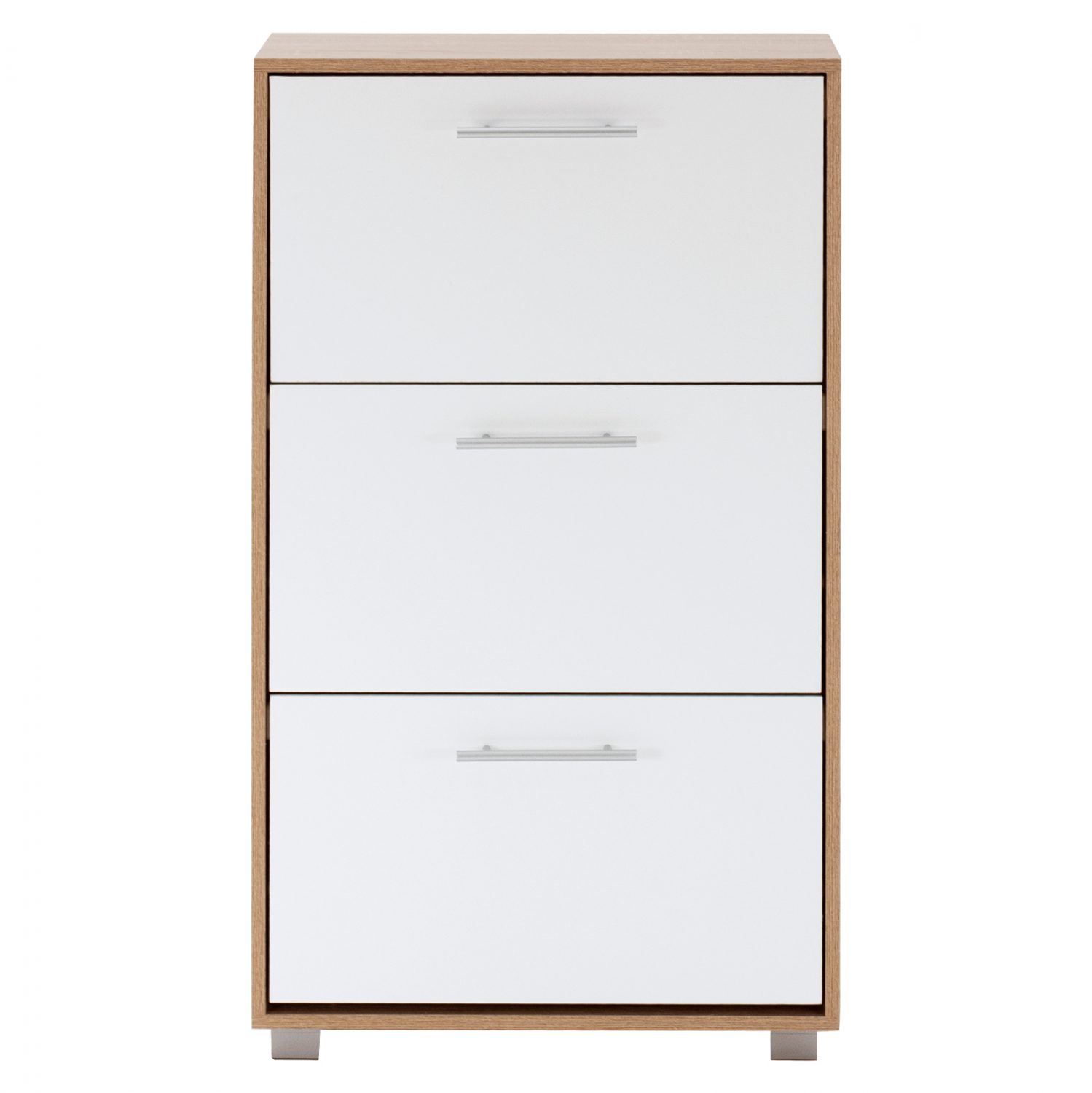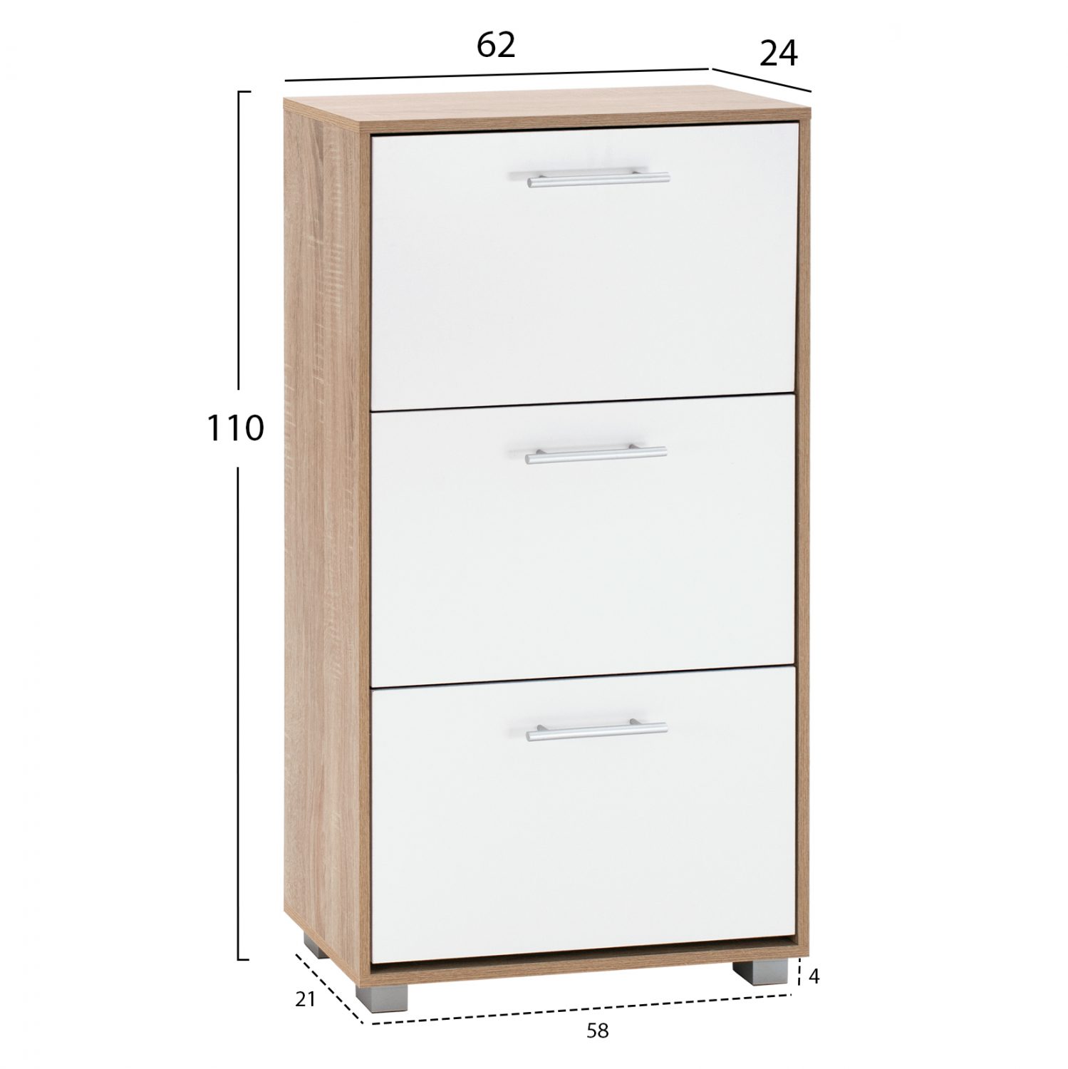 Παπουτσοθήκη από μελαμίνη άριστης ποιότητας, με 3 ανακλινόμενα ντουλάπια που χωράνε 18-21 ζευγάρια παπούτσια, σε sonama και λευκή απόχρωση με 3 πόρτες.