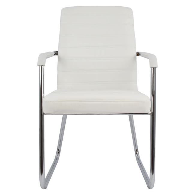 Κάντε τους επισκέπτες ή τους συνεργάτες σας να αισθανθούν άνετα με την καρέκλα DALEY. Πρόκειται για μια πολυθρόνα γραφείου συνεργασίας σε λευκό χρώμα και λιτό σχεδιασμό αλλά σίγουρα όμορφο. Είναι χρωμιωμένη ενώ το κάθισμα και η πλάτη είναι ενωμένα. Τα μπράτσα είναι επίπεδα και αποτελούν συνέχεια του σκελετού βάσης δημιουργώντας μια πανέμορφη εικόνα, ενώ η επένδυσή της είναι ριγέ PU, τόσο στο κάθισμα, όσο και στην πλάτη. Ο σκελετός της καρέκλας έχει όμορφες καμπύλες ενώ τα μπράτσα έχουν επένδυση πολυκαρβονική για πιο ευχάριστη υφή.