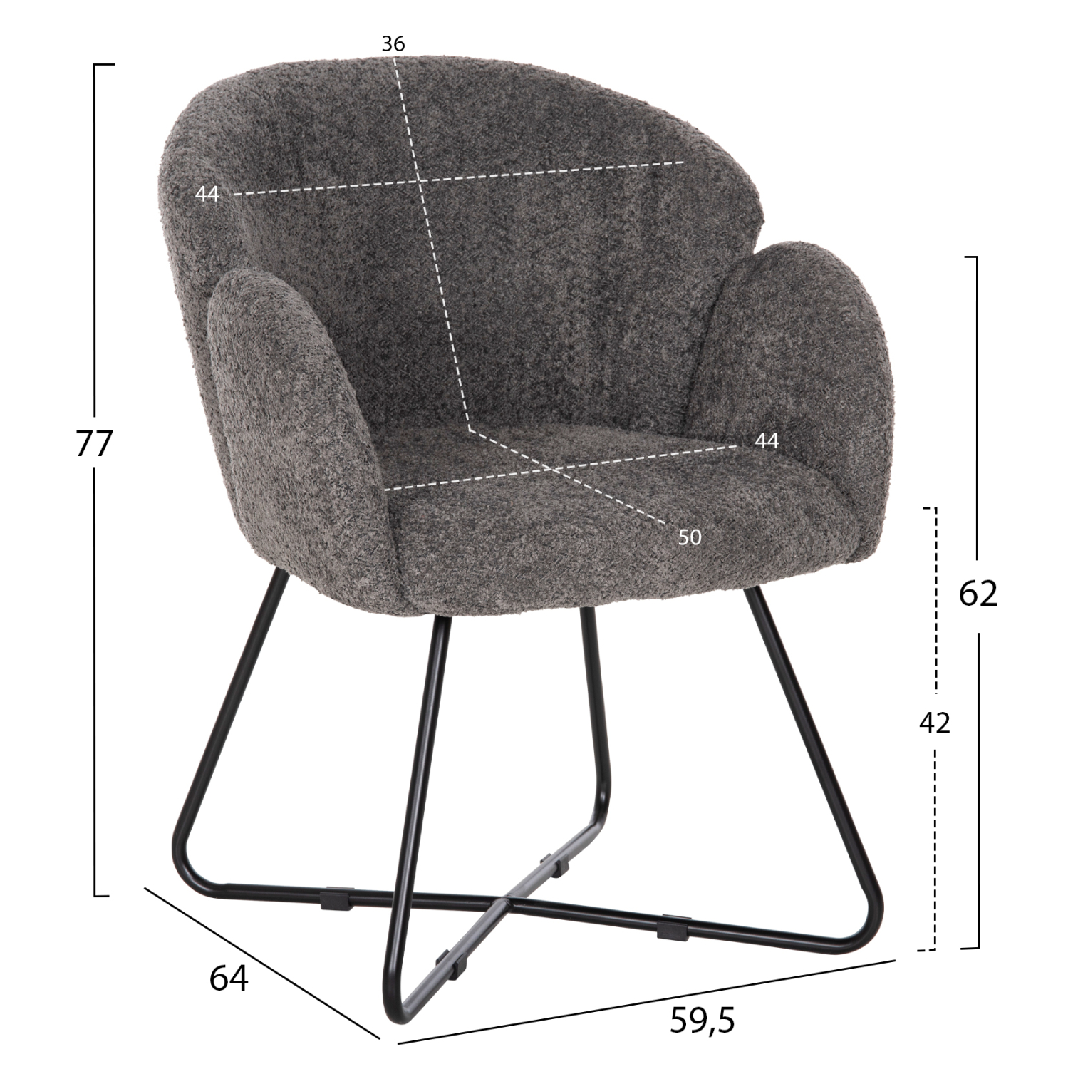 Η πολυθρόνα HARNIS είναι μοντέρνα και άνετη. Το κυρίαρχο χρώμα είναι το ΓΚΡΙ, ενώ αντί για πόδια διαθέτει μια βάση σε χιαστί διάταξη και μαύρο χρώμα. Η επένδυση της πολυθρόνας έχει γίνει με ζεστό ΜΠΟΥΚΛΕ ύφασμα που θα δώσει μια διαφορετική όψη στον χώρο σας. Πρόκειται για μια πρόταση όμορφη που θα ταιριάξει σχεδόν παντού!