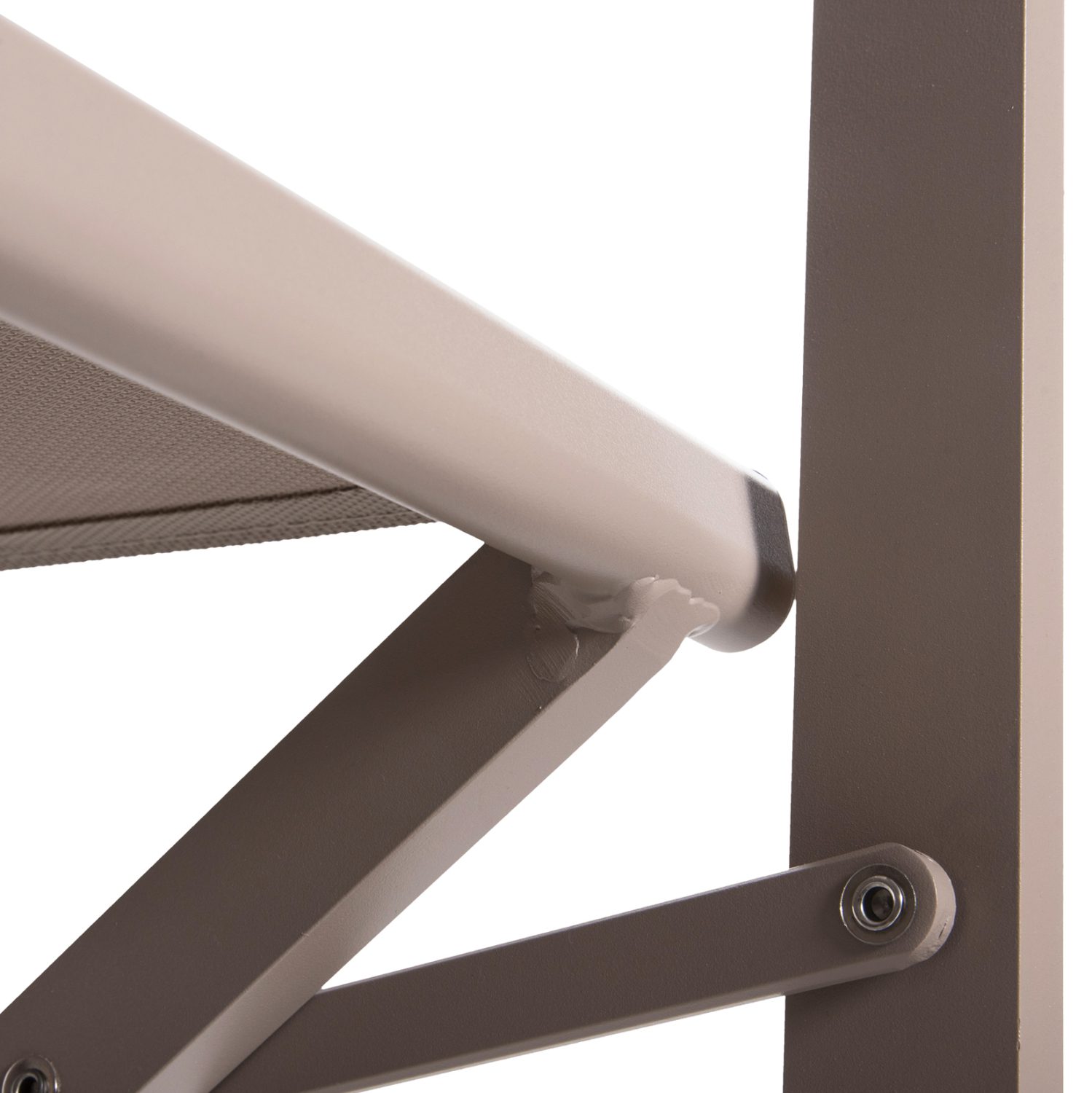 Η επένδυση της πολυθρόνας έχει γίνει με αδιάβροχο ενισχυμένο ύφασμα textilene 2×1. Αυτό είναι ένα παχύ, ισχυρό και ανθεκτικό πολυεστερικό ύφασμα. Σημαίνει ότι είναι κατασκευασμένο από πολυεστερικά νήματα υφασμένα από άκρη σε άκρη, και είναι επικαλυμμένο με PVC.