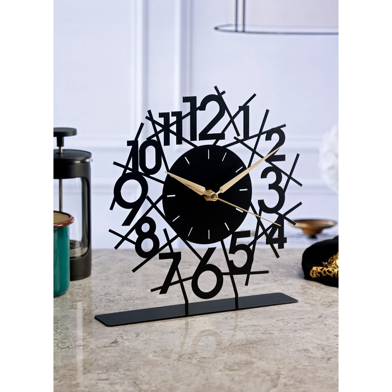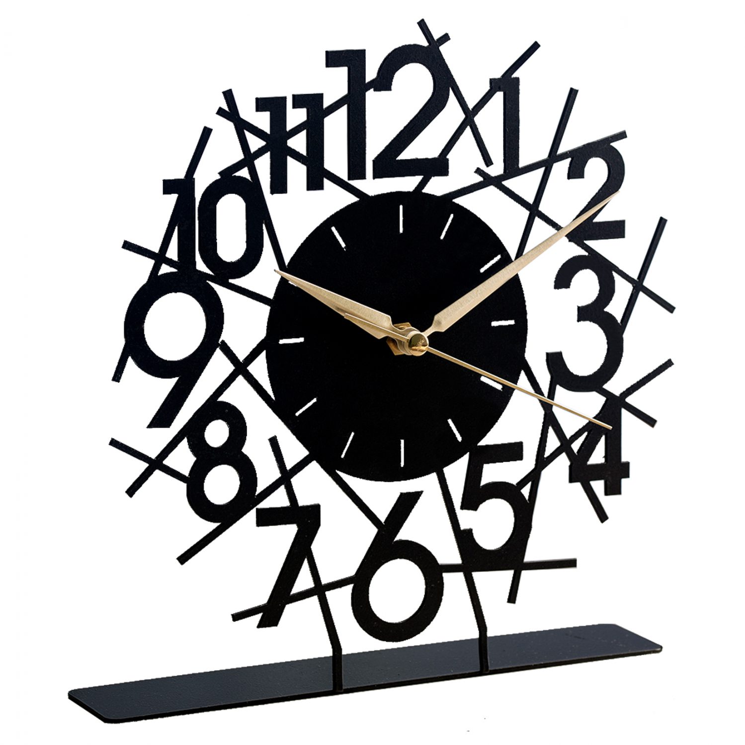 Ρολόι επιτραπέζιο σε μαύρη απόχρωση με χρυσές λεπτομέρειες στους δείκτες.