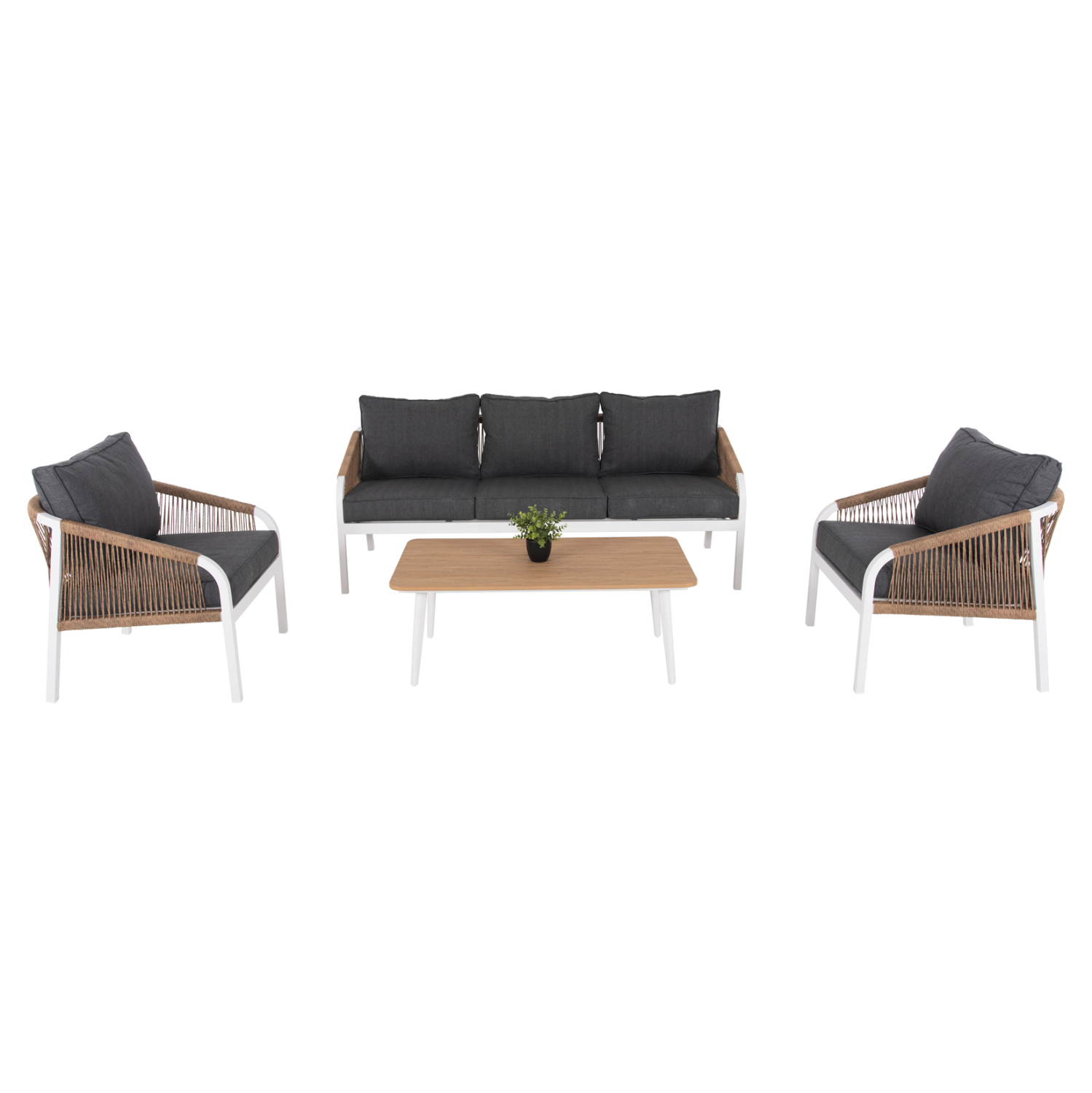 Σας παρουσιάζουμε το εντυπωσιακό και νέο σετ σαλονιού εξωτερικού χώρου MAERLY σε ΛΕΥΚΟ χρώμα, με τραπεζάκι, 2 πολυθρόνες και 1 τριθέσιο καναπέ. Ένα σετ που θα το λατρέψετε με την πρώτη ματιά. Ο σκελετός σε όλο το σετ είναι από αλουμίνιο επενδυμένο με ΜΠΕΖ συνθετικό σχοινί. Το design τους είναι πανέμορφο στην όψη ενώ η στιβαρότητά τους είναι εμφανής. Το κάθισμά στον καναπέ και τις πολυθρόνες είναι φαρδύ ενώ η πλάτη τους αγκαλιάζει το σώμα πράγμα που επιτείνει την άνεση που προσφέρουν, σε συνδυασμό με τα αναπαυτικά μαξιλάρια τόσο στο κάθισμα όσο και στην πλάτη. Ο τριθέσιος καναπές σε παρόμοιο design είναι, όμως, το πιο εντυπωσιακό κομμάτι αυτού του σετ με τις μεγάλες διαστάσεις του που τον καθιστούν το σημείο αναφοράς. Τα μαξιλάρια σε όλο το σετ είναι επενδυμένα με πολυεστερικό ύφασμα σε ΑΝΘΡΑΚΙ χρώμα και διαθέτουν γέμισμα με μέτριας σκληρότητας αφρώδη υλικά για την μεγαλύτερη δυνατή άνεση, αλλά και φερμουάρ. Τι άλλο να ζητήσει κανείς για να αναβαθμίσει τον εξωτερικό χώρο της επιχείρησής του;