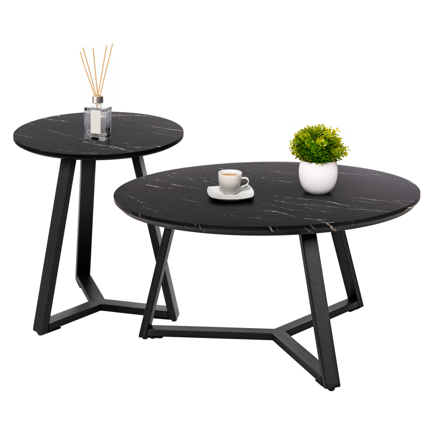 Ανακαλύψτε το σετ 2 στρογγυλών τραπεζιών σαλονιού ROCKET. Πρόκειται για 2 τραπεζάκια με διαφορετικές διαστάσεις που θα αποτελέσουν όμορφα αλλά και χρήσιμα στοιχεία στον χώρο σας. Οι επιφάνειες στηρίζονται σε μοντέρνες τρίποδες μεταλλικές βάσεις σε ΜΑΥΡΟ σαγρέ χρώμα, και είναι κατασκευασμένες από MDF σε χρώμα ΜΑΥΡΟΥ ΜΑΡΜΑΡΟΥ.