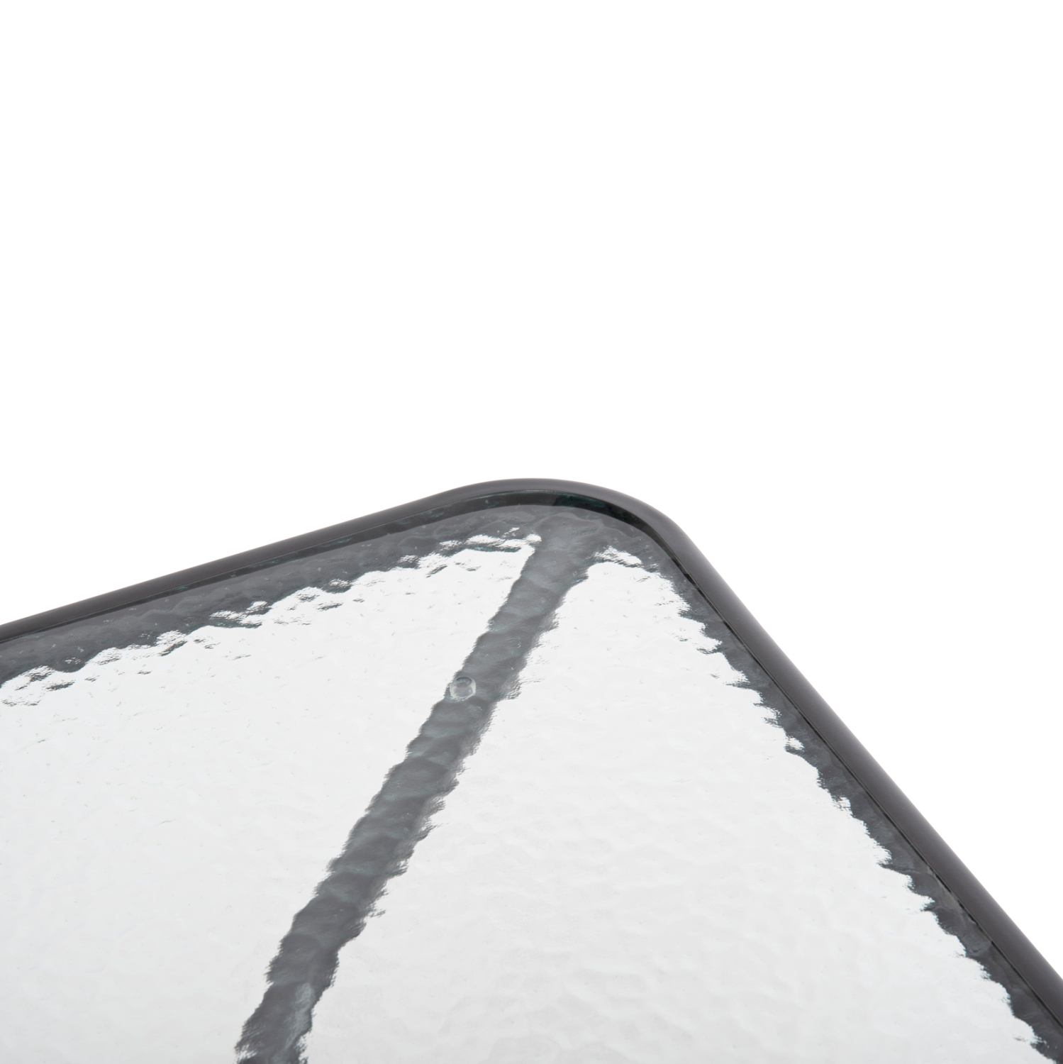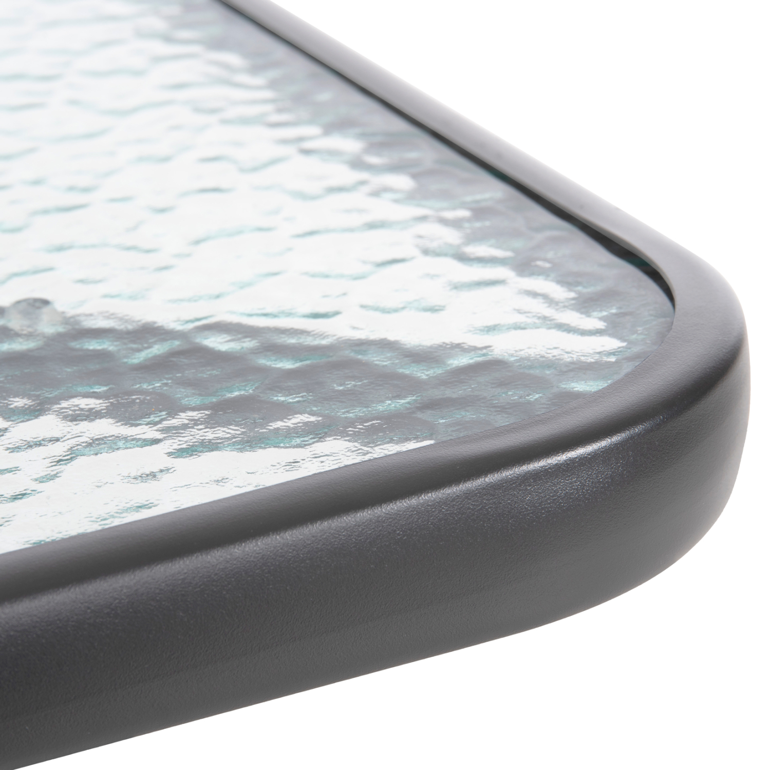 Ένα τραπέζι κατασκευασμένο από μεταλλικό σκελετό σε γκρι απόχρωση με γυάλινη επιφάνεια.