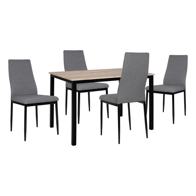 Τέσσερις καρέκλες κουζίνας από μεταλλικό σκελετό σε μαύρο χρώμα και επένδυση από ύφασμα σε γκρι απόχρωση.