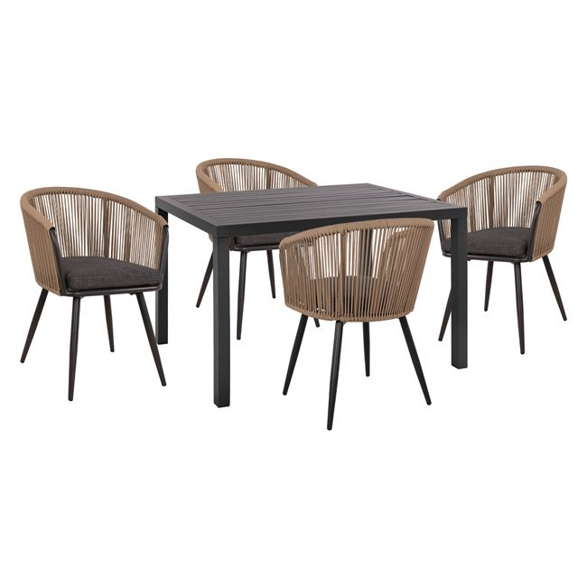 Τέσσερις πολυθρόνες αλουμινίου, επαγγελματικών προδιαγραφών με ανθρακί σκελετό, επενδυμένες με πλεκτό σχοινί σε μπεζ απόχρωση.