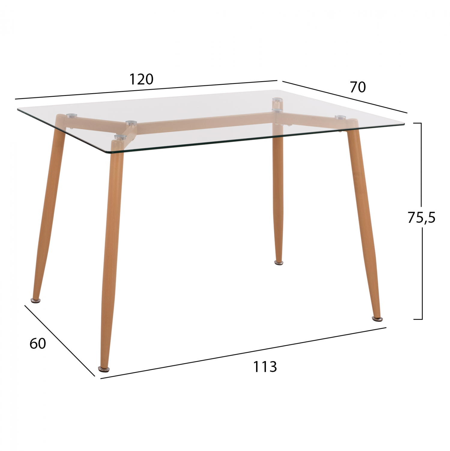 Ελκυστικό και μοντέρνο τραπέζι με μεταλλικά πόδια βαμμένα έτσι ώστε να αποδίδουν την όψη ξύλου και γυάλινη επιφάνεια. Ο συνδυασμός αυτός το κάνει μια εκπληκτική ιδέα για την κουζίνα σας.