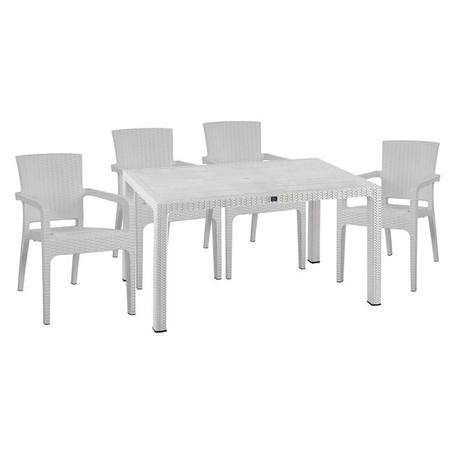 Ένα τραπέζι πολυπροπυλενίου εξωτερικού χώρου σε λευκή απόχρωση με rattan λεπτομέρειες περιμετρικά της επιφάνειας. Διαθέτει UV protection για μεγαλύτερη προστασία από τον ήλιο.