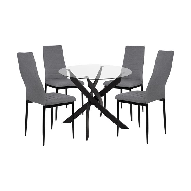 Τέσσερις μοντέρνες καρέκλες από μεταλλικό σκελετό σε μαύρο χρώμα και επένδυση από ύφασμα σε γκρι απόχρωση.