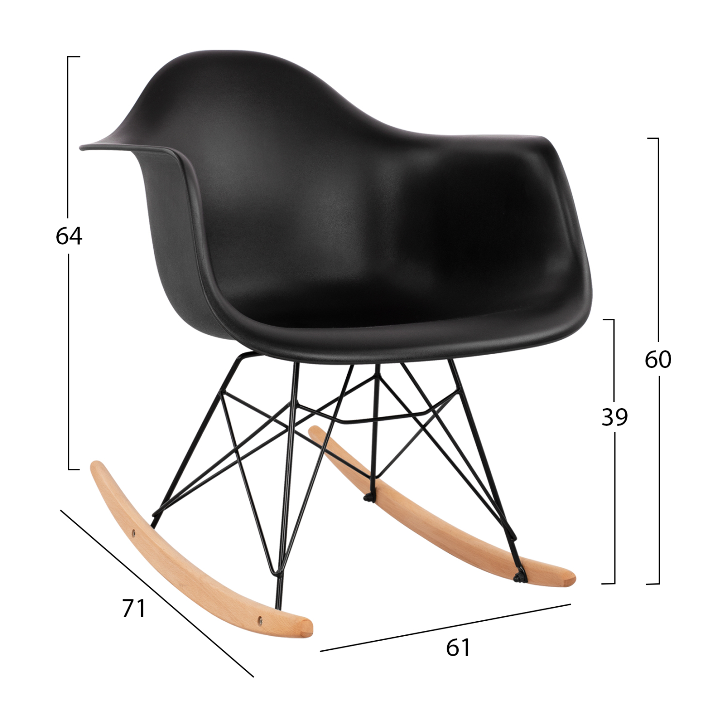 Κουνιστή πολυθρόνα σε συνδυασμό ξύλου-μετάλλου-πολυπροπυλενίου σε χρώμα μαύρο. Διαστάσεις: 61x71x64Υ εκ.
