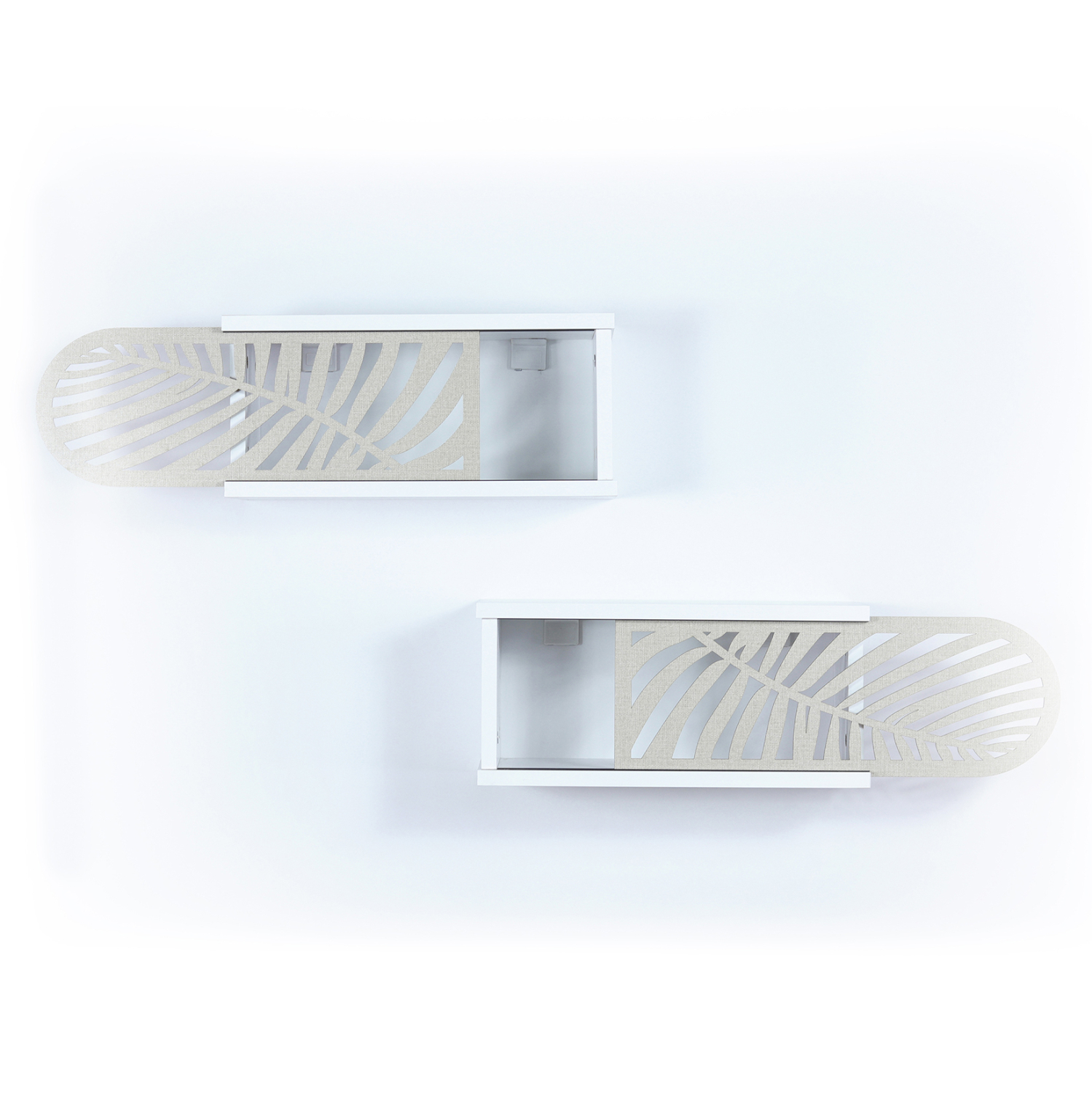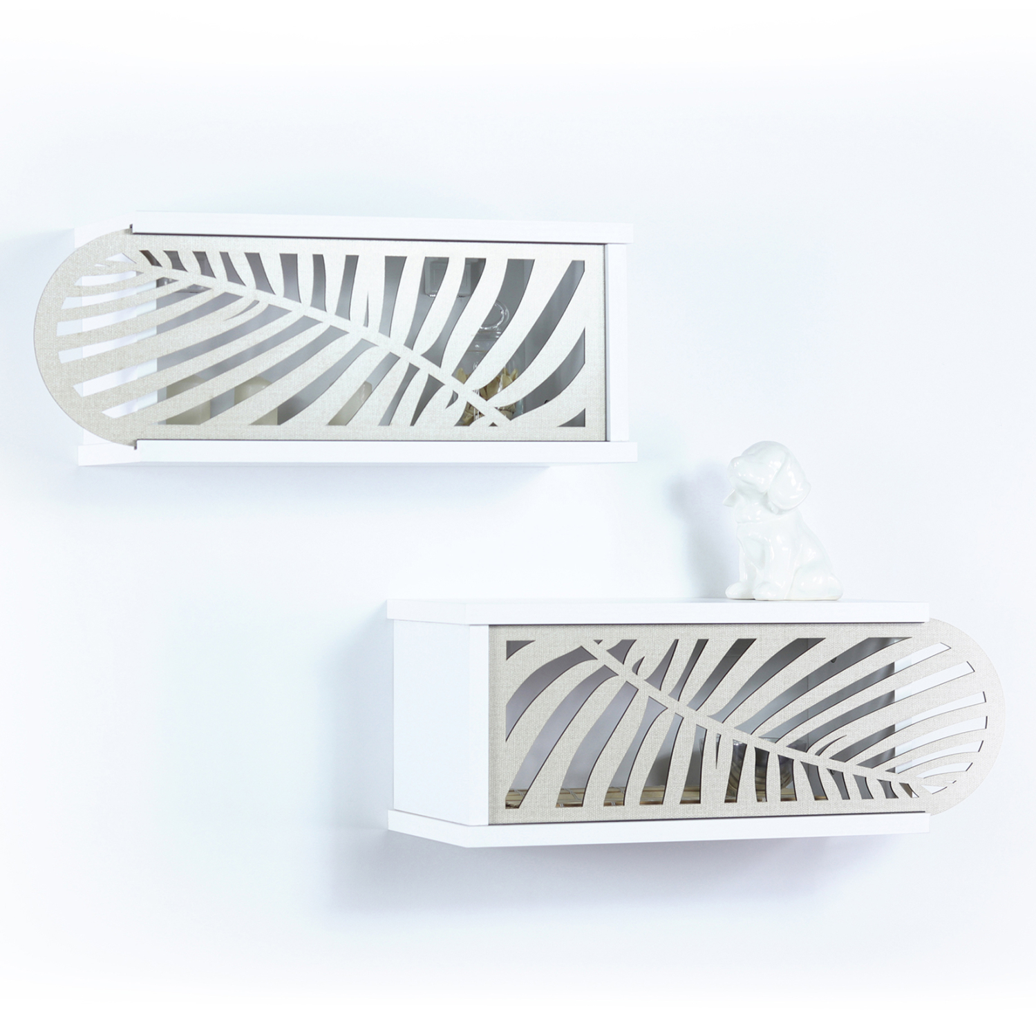 Σετ ράφια τοίχου με συρόμενα πορτάκια σε λευκή απόχρωση με λεπτομέρειες σε εκρού χρώμα.