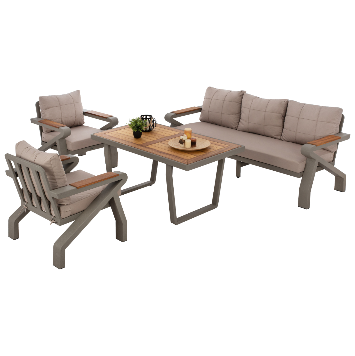 ΗΜ5885.01—Σας παρουσιάζουμε το εντυπωσιακό και νέο σετ εξωτερικού χώρου σε ΓΚΡΙ χρώμα, με τραπεζάκι, 2 πολυθρόνες και 1 τριθέσιο καναπέ. Ένα σετ που θα το λατρέψετε με την πρώτη ματιά. Το όμορφο τραπέζι έχει επιφάνεια από ξύλο ΙΡΟΚΟ και τραπεζοειδείς βάσεις αντί για παραδοσιακά πόδια. Οι πολυθρόνες είναι εξίσου εντυπωσιακές. Το design τους είναι πανέμορφο στην όψη ενώ η στιβαρότητά τους είναι εμφανής χάρη στα φαρδιά τετραγωνισμένα πόδια που το επάνω μέρος τους αποτελεί τα μπράτσα αυτών των πολυθρόνων. Το κάθισμά τους είναι φαρδύ ενώ η πλάτη τους έχει μια ελαφριά κλίση προς τα πίσω πράγμα που επιτείνει την άνεση που προσφέρουν, σε συνδυασμό με τα αναπαυτικά μαξιλάρια τόσο στο κάθισμα όσο και στην πλάτη. Ο τριθέσιος καναπές σε παρόμοιο design είναι, όμως, το πιο εντυπωσιακό κομμάτι αυτού του σετ με τις μεγάλες διαστάσεις του που τον καθιστούν το σημείο αναφοράς. Τα μαξιλάρια σε όλο το σετ είναι επενδυμένα με ποιοτικό ύφασμα σε ΜΠΕΖ χρώμα και διαθέτουν γέμισμα με μέτριας σκληρότητας αφρώδη υλικά για την μεγαλύτερη δυνατή άνεση. Τι άλλο να ζητήσει κανείς για να αναβαθμίσει τον κήπο, το μπαλκόνι ή την αυλή του;