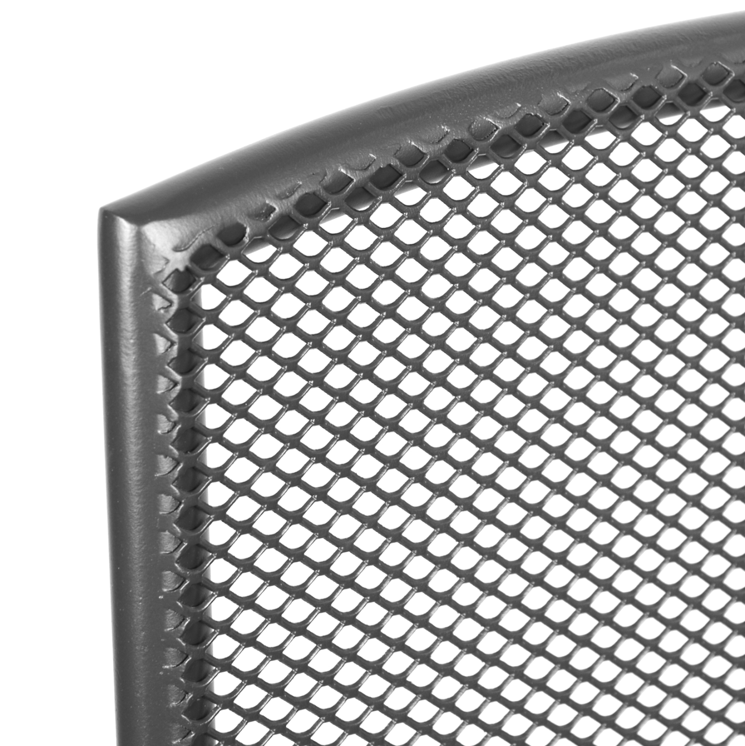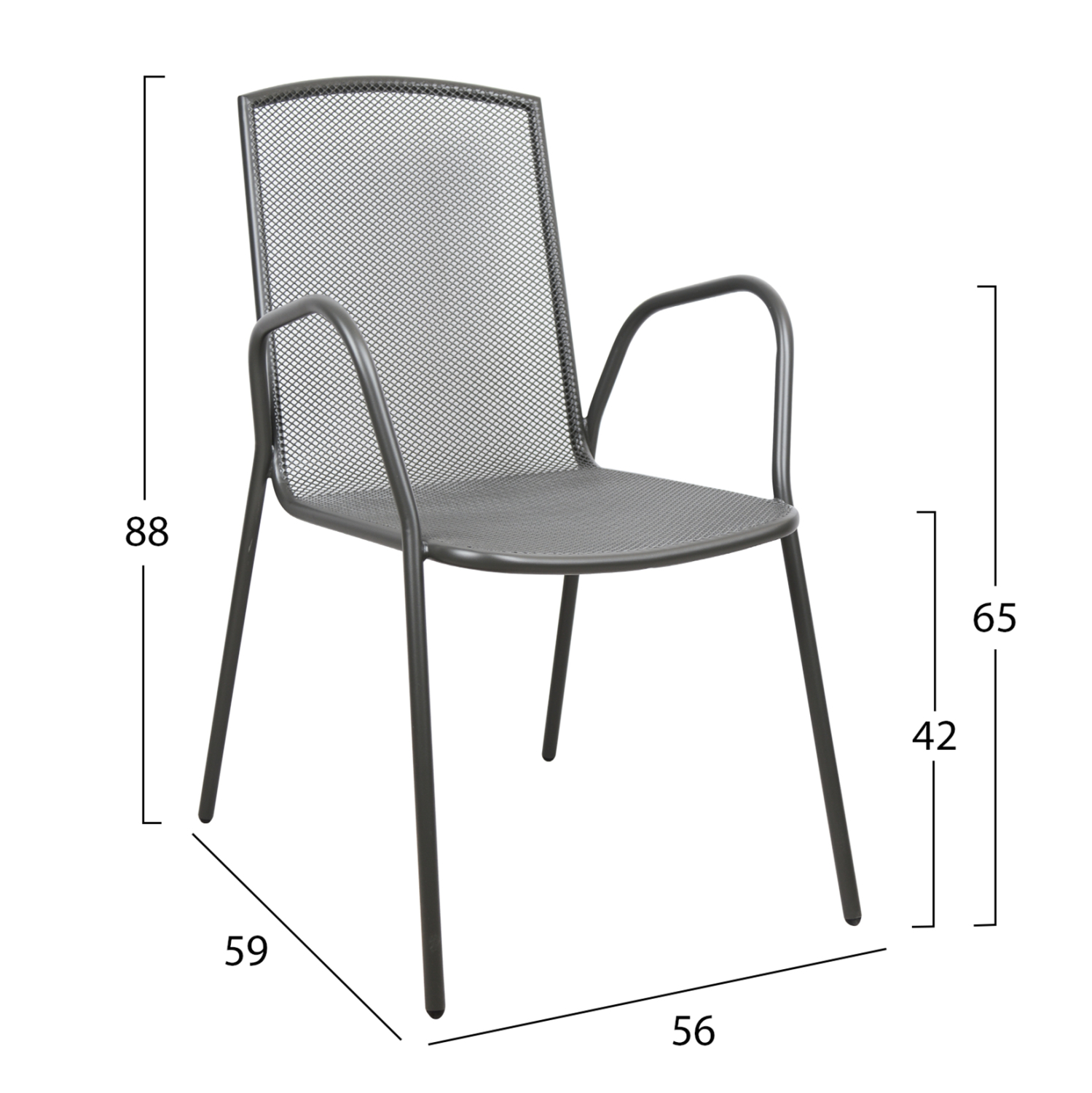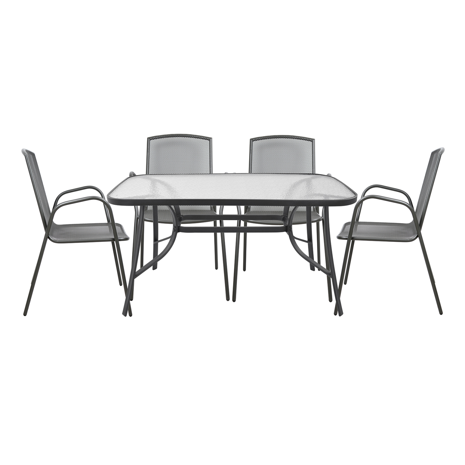 Τέσσερις πολυθρόνες μεταλλικές για εξωτερικό χώρο. Η βάση και το κάθισμα της καρέκλας είναι από μεταλλικό πλέγμα.