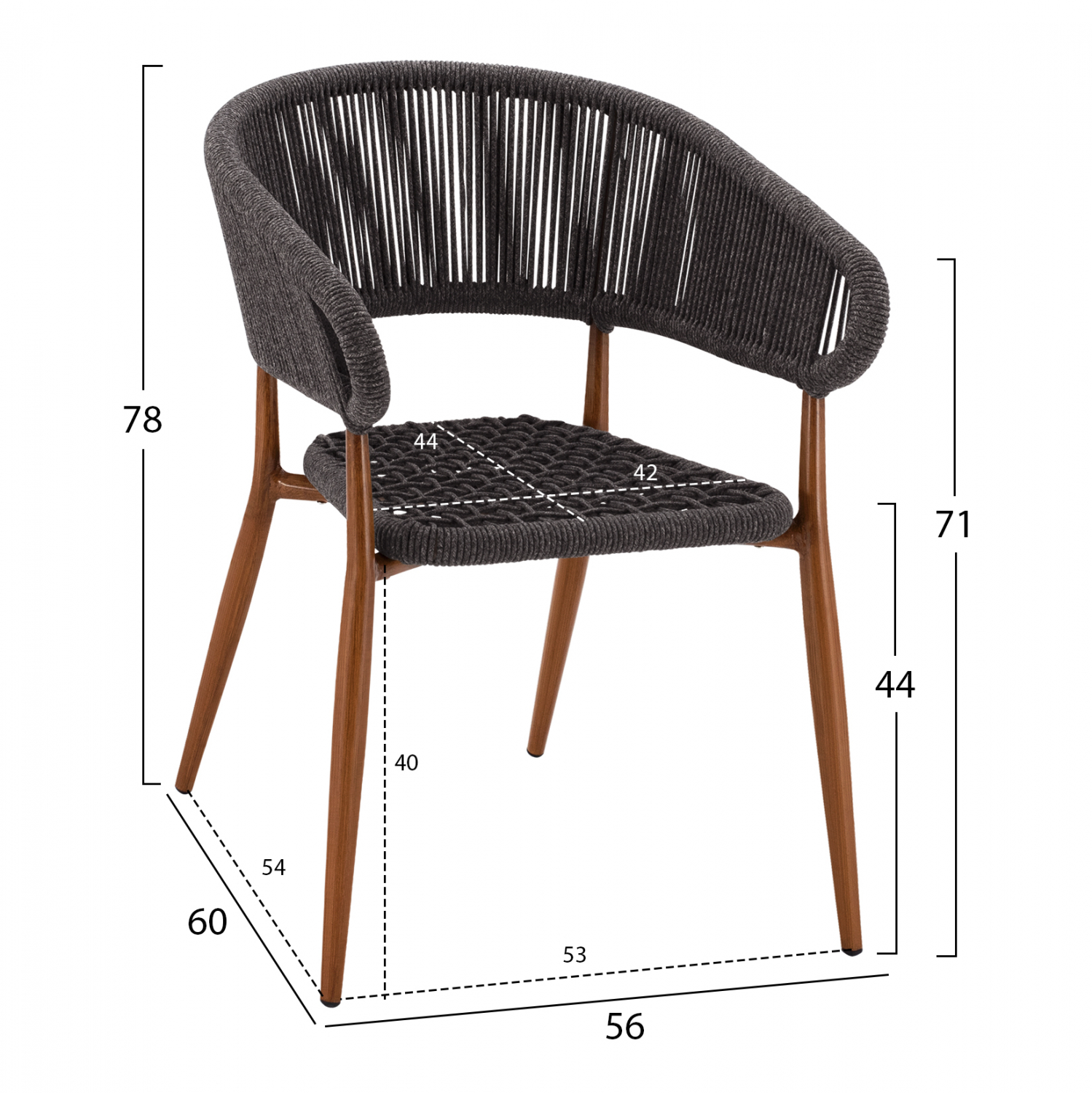 καφέ απόχρωση, επενδυμένες με πλεκτό σχοινί στο κάθισμα και στην πλάτη σε γκρι απόχρωση.