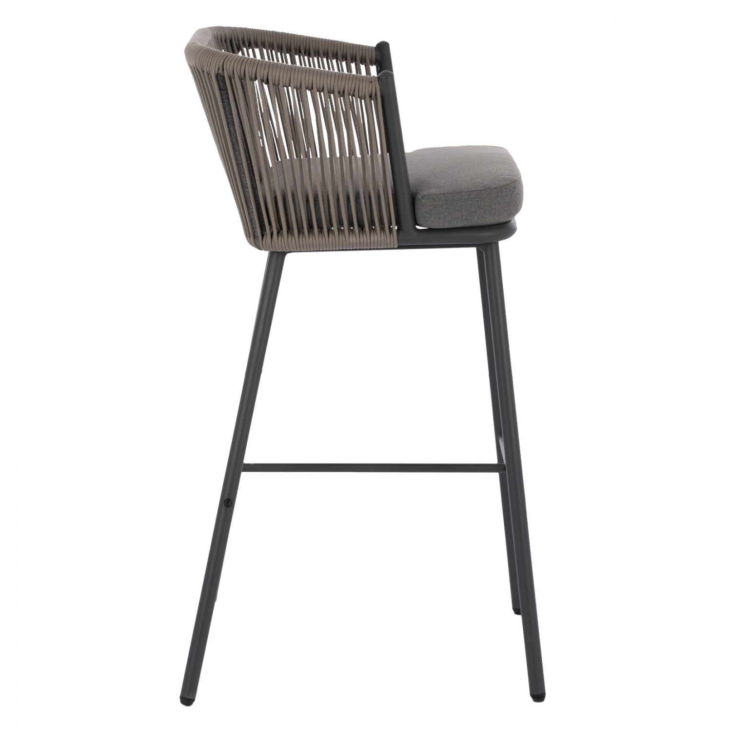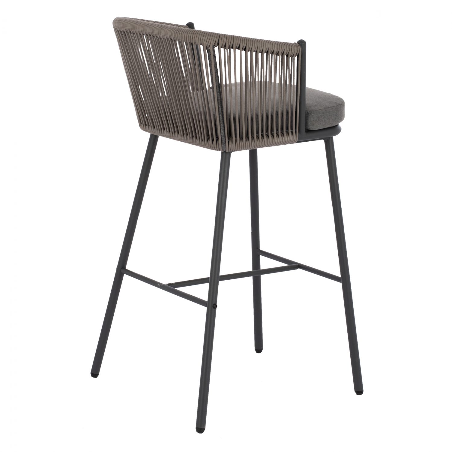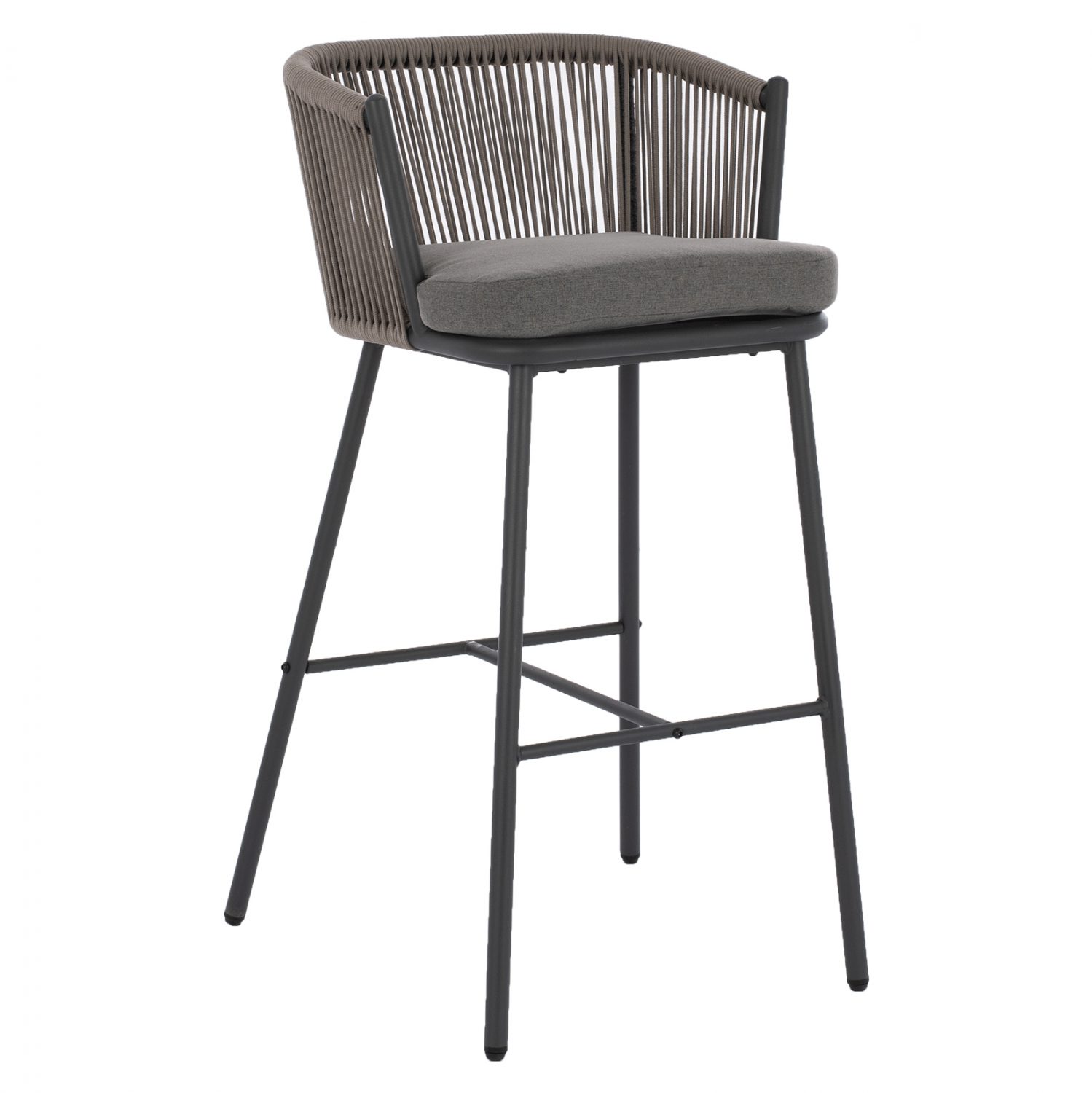 Μοντέρνο σκαμπό με πλάτη και μαξιλάρι, εξωτερικού αλλά και εσωτερικού χώρου, κατασκευασμένο από μεταλλικό σκελετό σε γκρι απόχρωση, επενδυμένο με πλεκτό σχοινί σε επίσης γκρι απόχρωση.