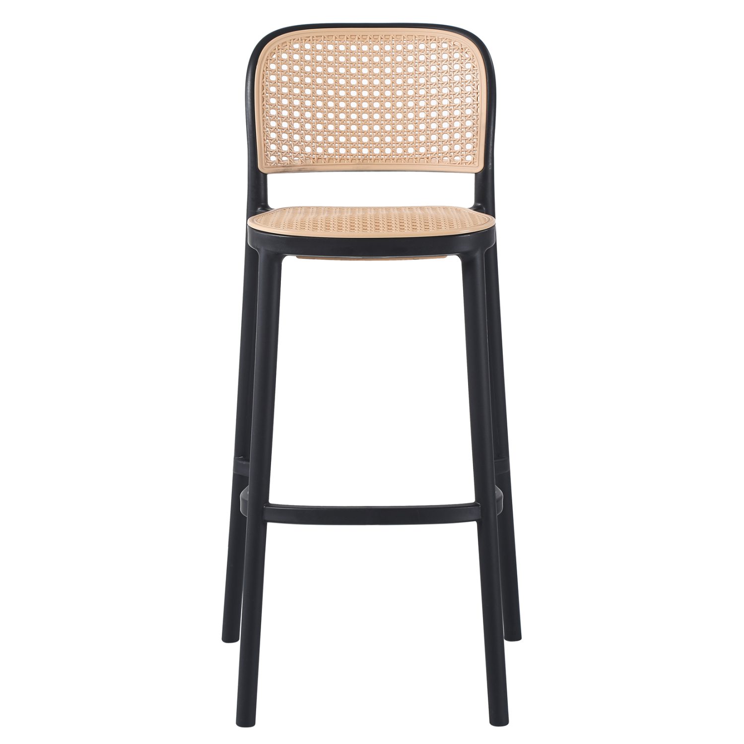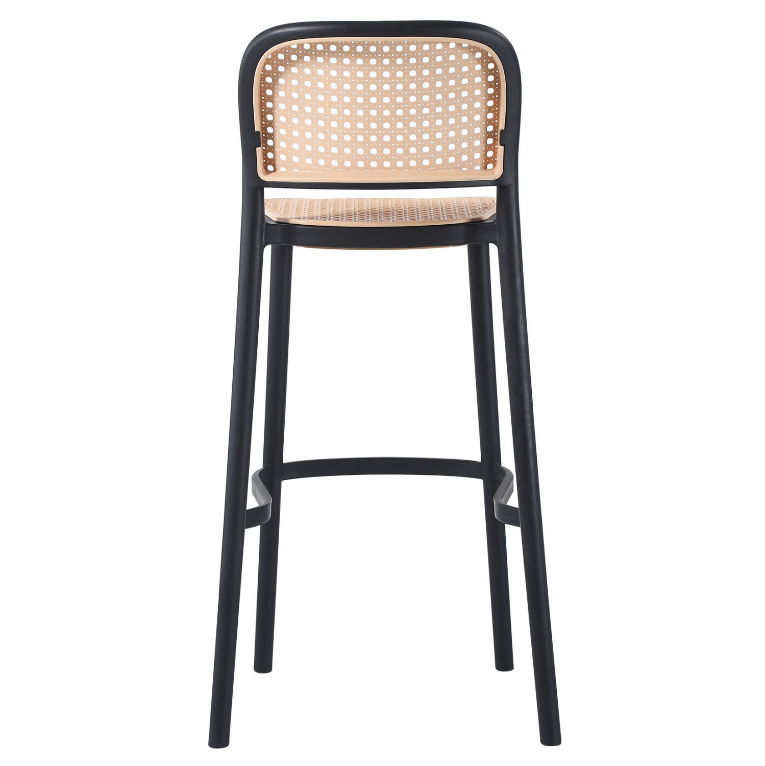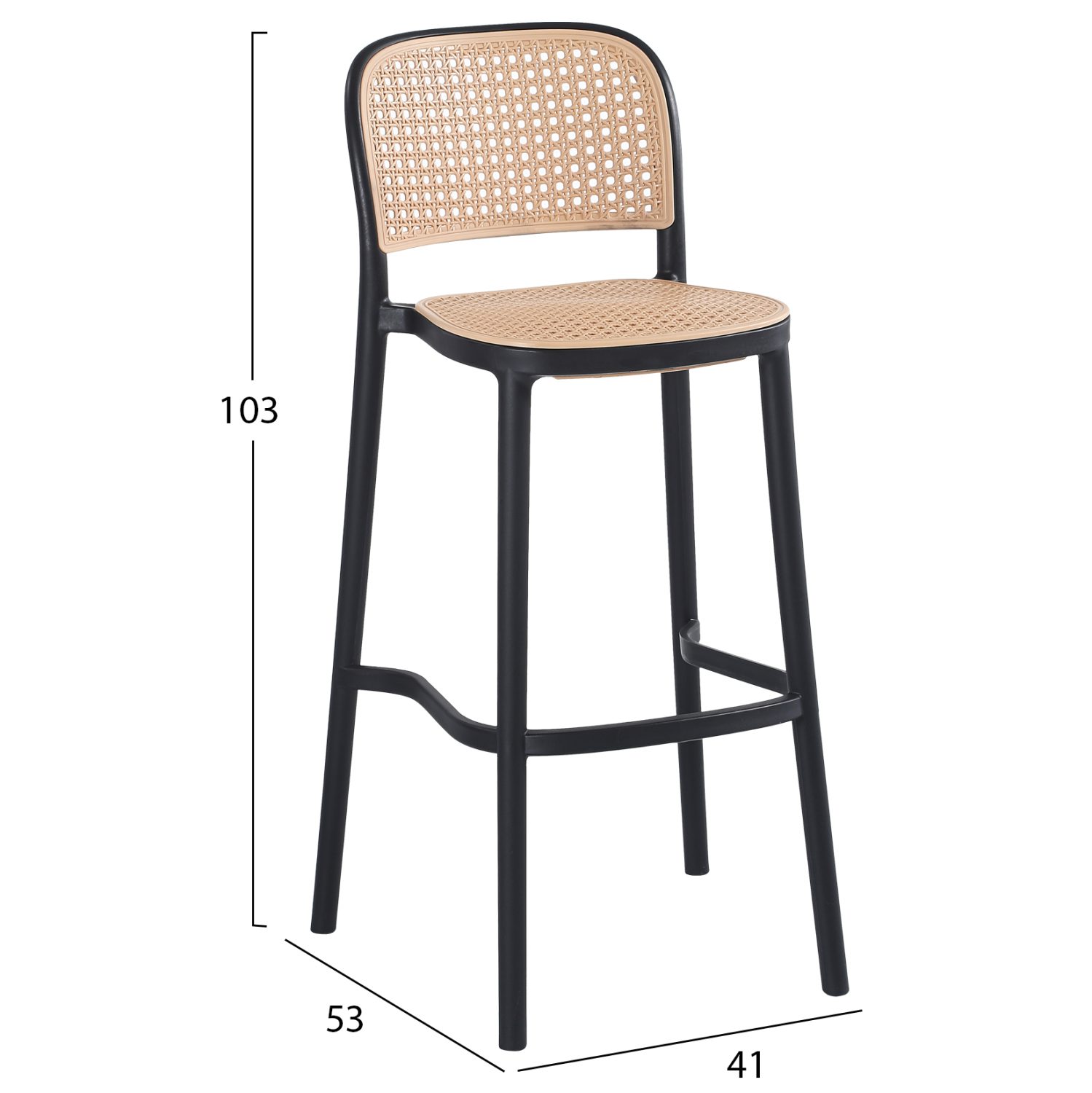 Όλο το σκαμπό είναι από μονοκόμματο πολυπροπυλένιο σε ΜΑΥΡΟ χρώμα με σχετικά χαμηλή πλάτη η οποία είναι σε στυλ “ψάθας” πολυπροπυλενίου, όπως και το κάθισμα, σε ΜΠΕΖ απόχρωση.