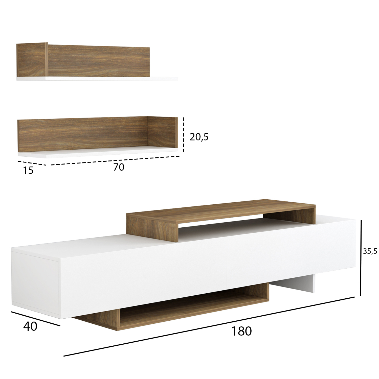 Το EDUARDO είναι μια μοντέρνα σύνθεση τηλεόρασης, που θα ομορφύνει το σαλόνι σας! Αποτελείται από 2 μέρη. Το έπιπλο δαπέδου που διαθέτει 2 ντουλάπια (λευκά) κι ένα ράφι, και μια επιτοίχια σύνθεση με 2 ανεξάρτητα ράφια, παρόμοιας αισθητικής. Η σύνθεση έρχεται σε όμορφη διχρωμία ΛΕΥΚΟΥ-ΦΥΣΙΚΟΥ και θα απογειώσει την εικόνα του σαλονιού σας.