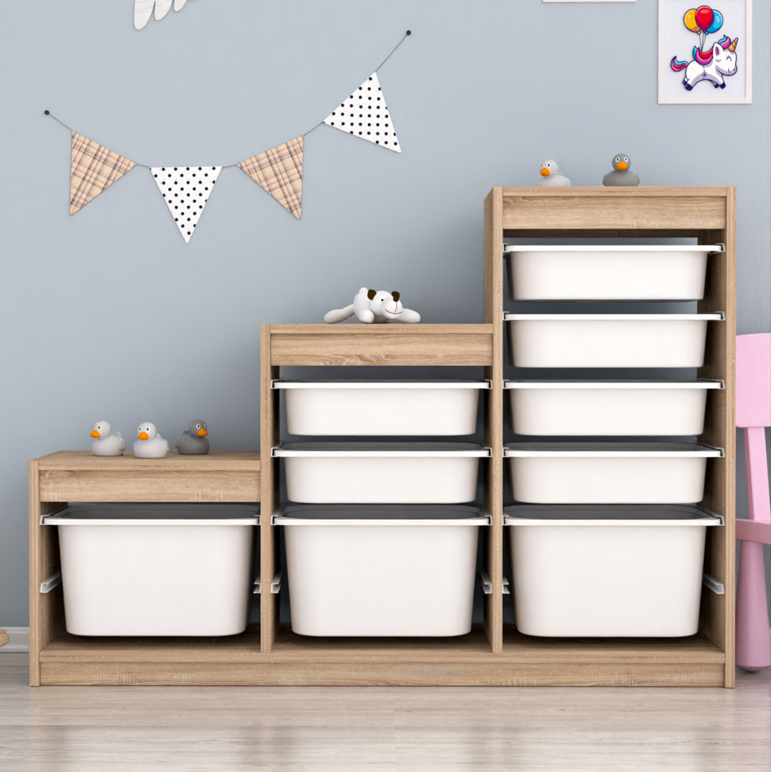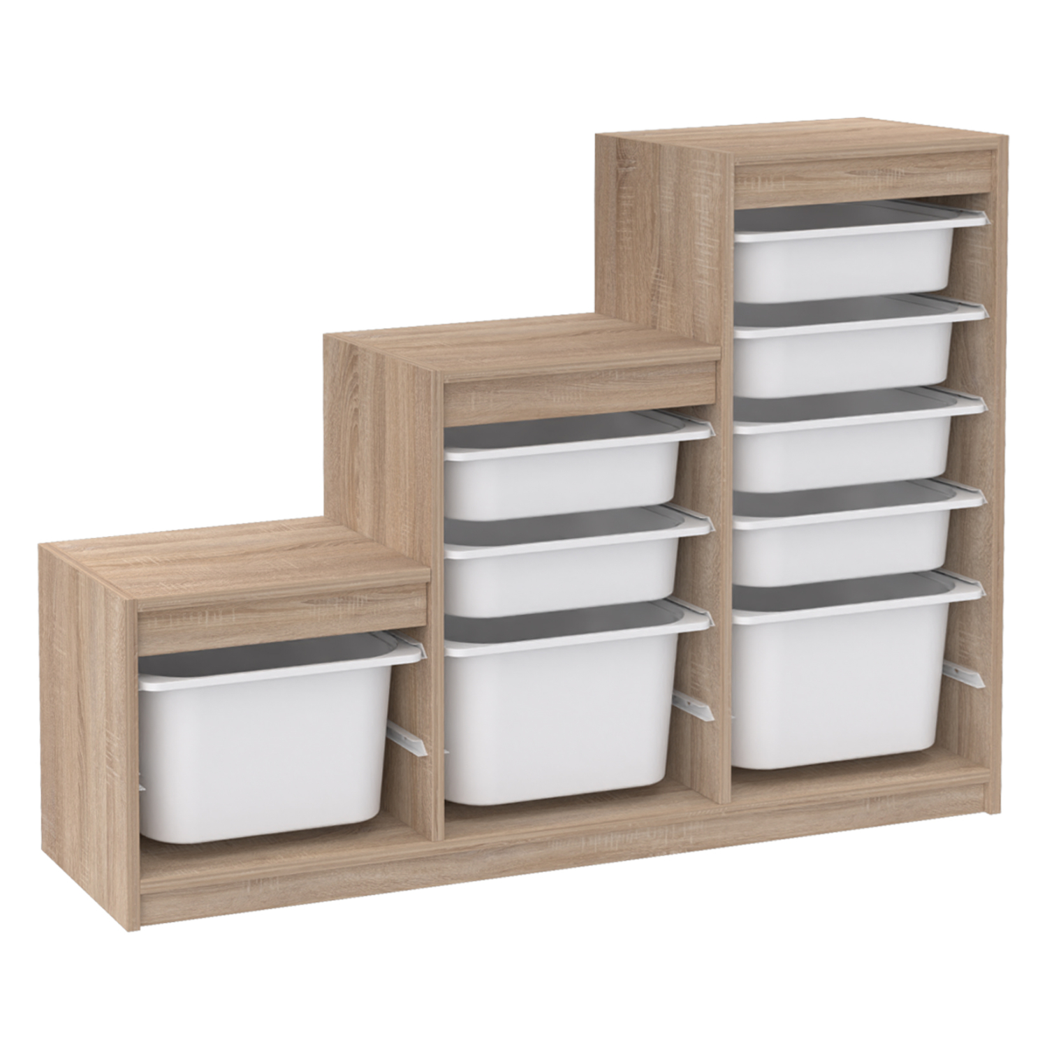 Η SANI είναι μια συρταριέρα με πλαίσιο από μελαμίνη σε χρώμα SONAMA, και 9 ΛΕΥΚΑ συρτάρια από πολυαιθυλένιο (πλαστικό), σε 3 στήλες με διαφορετικό ύψος. Ιδανική συρταριέρα για την καλύτερη οργάνωση του παιδικού δωματίου.