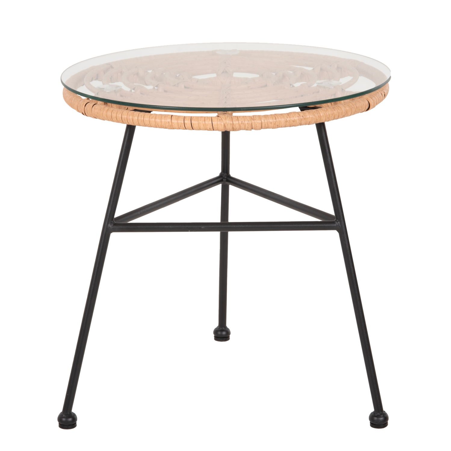 Το κοντό τραπέζι εξωτερικού χώρου της σειράς επίπλων ALLEGRA έχει ΜΑΥΡΟ μεταλλικό σκελετό με 3 πόδια. Το επάνω μέρος του σκελετού είναι επενδυμένο με συνθετικό Rattan σε ΜΠΕΖ χρώμα και σε κυκλική διάταξη, έτσι ώστε να τοποθετηθεί το στρογγυλό γυαλί ασφαλείας της επιφάνειας. Οι διαστάσεις του το κάνουν ιδανικό για μικρότερους χώρους, τόσο επαγγελματικούς, όσο και για το σπίτι.
