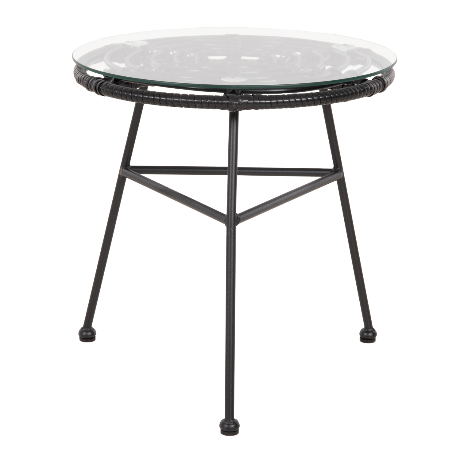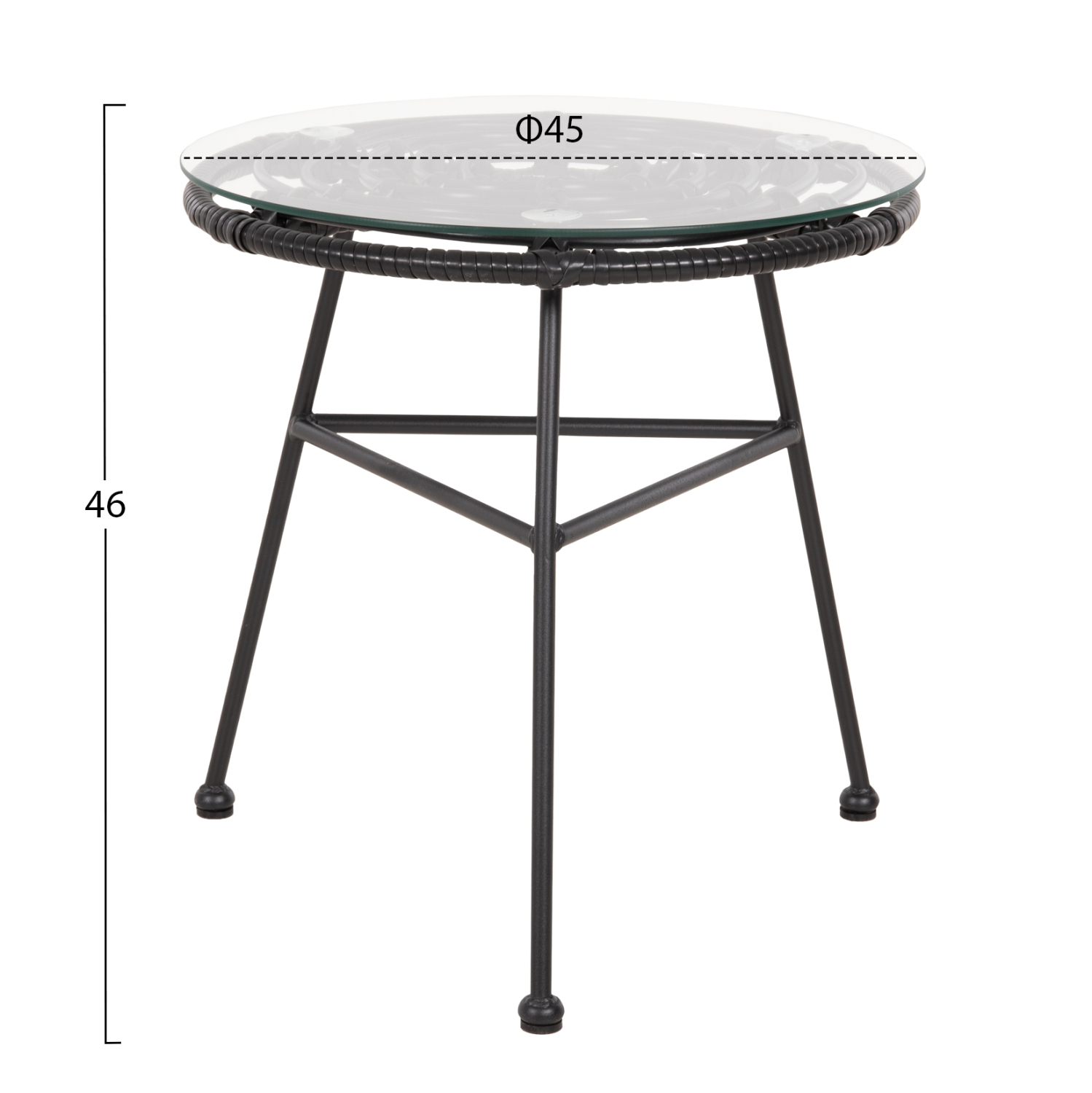 Το κοντό τραπέζι εξωτερικού χώρου της σειράς επίπλων ALLEGRA έχει ΜΑΥΡΟ μεταλλικό σκελετό με 3 πόδια. Το επάνω μέρος του σκελετού είναι επενδυμένο με συνθετικό Rattan σε ΜΑΥΡΟ χρώμα και σε κυκλική διάταξη, έτσι ώστε να τοποθετηθεί το στρογγυλό γυαλί ασφαλείας της επιφάνειας. Οι διαστάσεις του το κάνουν ιδανικό για μικρότερους χώρους, τόσο επαγγελματικούς, όσο και για το σπίτι.