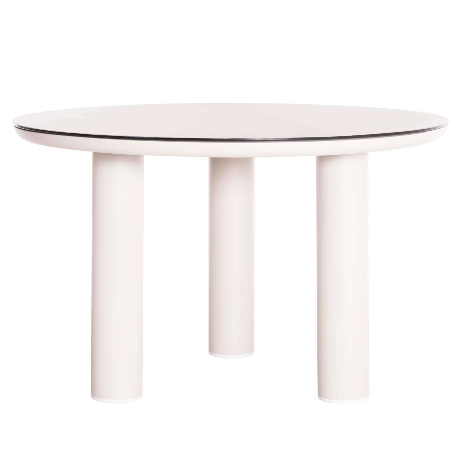Το DOSUN είναι ένα στρογγυλό τραπέζι τραπεζαρίας για εξωτερικούς χώρους με σκελετό αλουμινίου σε ΚΡΕΜ απόχρωση με 3 κυλινδρικά πόδια/κολώνες. Η επιφάνεια είναι από 3D PRINTED γυαλί σε ανοιχτό ΓΚΡΙ χρωματισμό, και με όψη κεραμική. Πρόκειται για ένα όμορφο τραπέζι σε κανονική διάσταση, που μπορεί να εξυπηρετήσει μέχρι 5 άτομα.