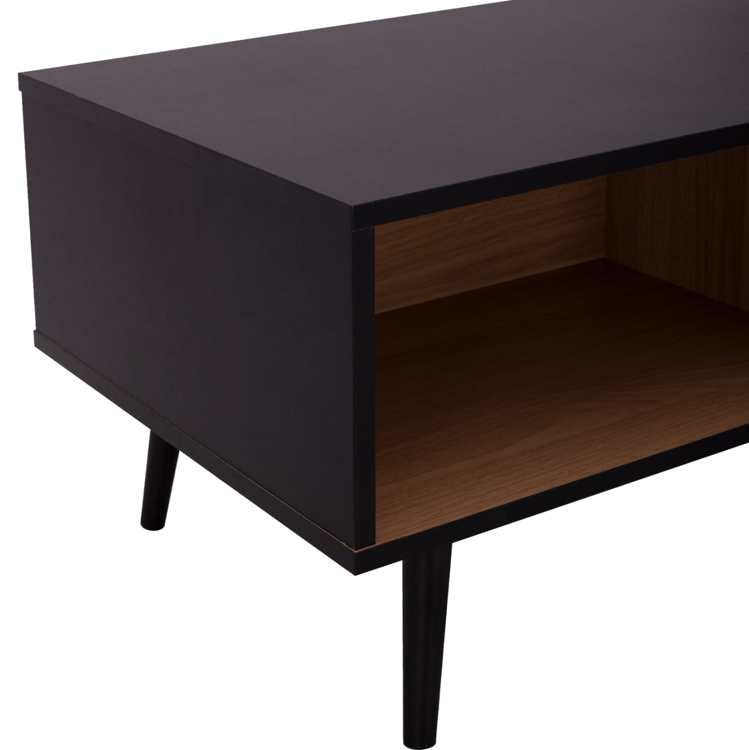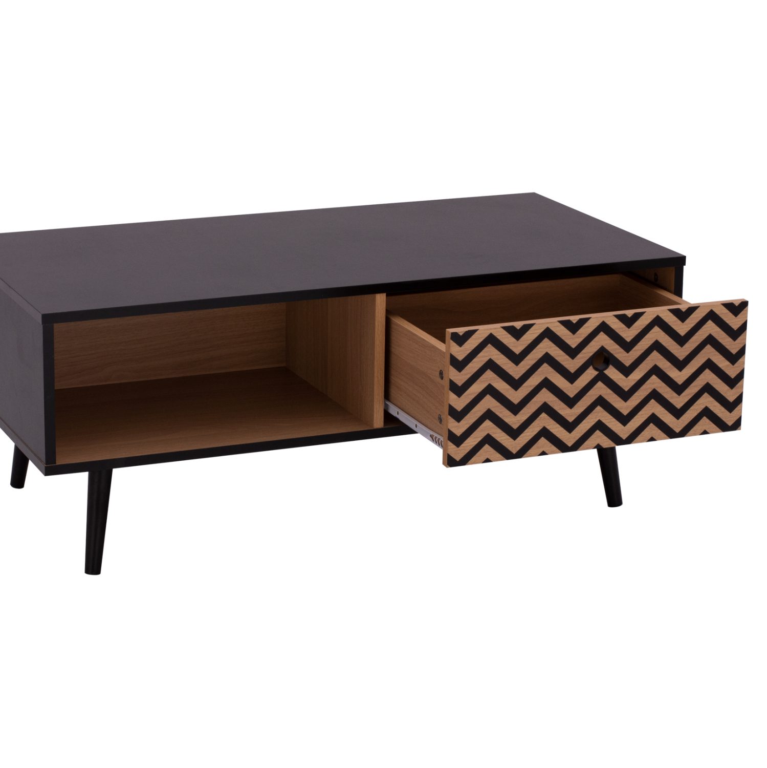 Μοντέρνο τραπεζάκι σαλονιού από τη σειρά CHARLEEN κατασκευασμένο από μελαμίνη σε φυσική απόχρωση, με μαύρες λεπτομέρειες.