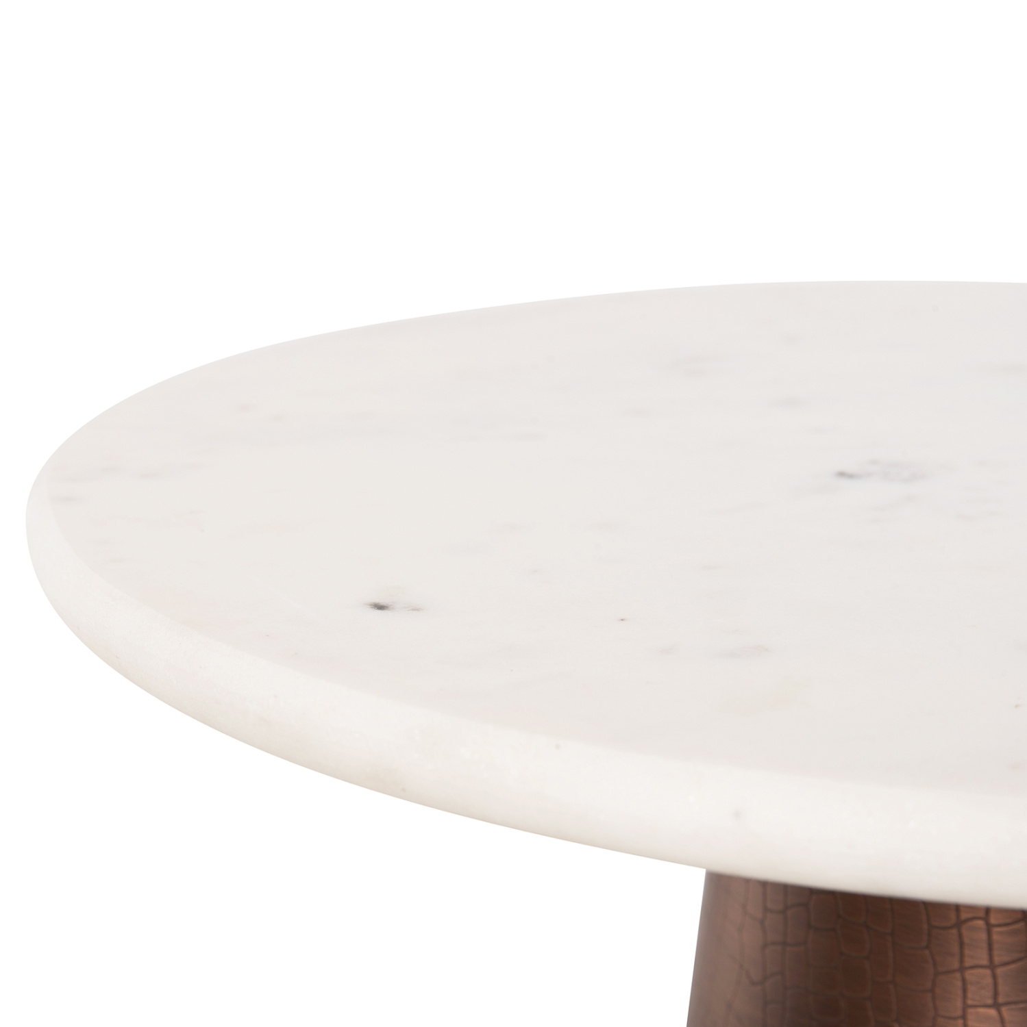 Ανακαλύψτε το υπέροχο βοηθητικό τραπεζάκι FODEN για το σαλόνι. Πρόκειται για ένα μεταλλικό τραπεζάκι με στρογγυλή επιφάνεια από ΛΕΥΚΟ ΜΑΡΜΑΡΟ και κωνική μεταλλική βάση σε σκούρο ΧΑΛΚΙΝΟ χρώμα. Θα δώσει μια εικόνα καθαρότητας και πολυτέλειας στον χώρο σας. Ιδανικό τόσο για το σπίτι, όσο και για επαγγελματικούς χώρους.